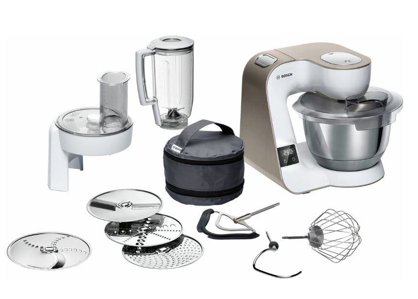 Bosch kuhinjski aparat MUM5, snaga: 1000 W, bijela+boja šampanjca. Fleksibilan uređaj za pripremu širokog raspona raznolikih jela. S integriranom vagom, sada još jednostavnije. Velika zdjela od nehrđajućeg čelika kapaciteta od 3,9 l: poseban oblik unutrašnjosti za optimalnu pripremu tijesta. (do 2,7 kg mješavine za torte ili 1.9 kg dizanog tijesta). Integrirana vaga: svi sastojci mogu se vagati izravno u zdjeli ili dodatnoj opremi. Savršeni rezultati zahvaljujući sustavu 3D PlanetaryMixing koji osigurava optimalno miješanje svih sastojaka. Postavka automatskog stanja pripravnosti nastavaka za jednostavno punjenje zdjele.