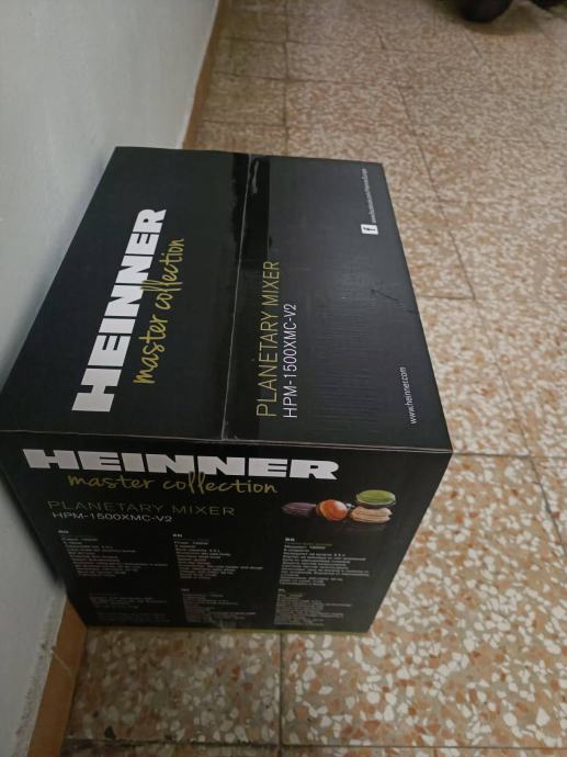 Heinner HPM-1500XMC-V2 planetarni mikser, snaga: 1500W, 6 brzina, kapacitet posude: 5,5L, tijelo miješalice od lijevanog aluminija, zdjela od nehrđajućeg čelika, zaštita od prskanja, protuklizni sustav, pribor: kuka za gnječenje, pjenjača od nehrđajućeg čelika, razina buke: 93dB