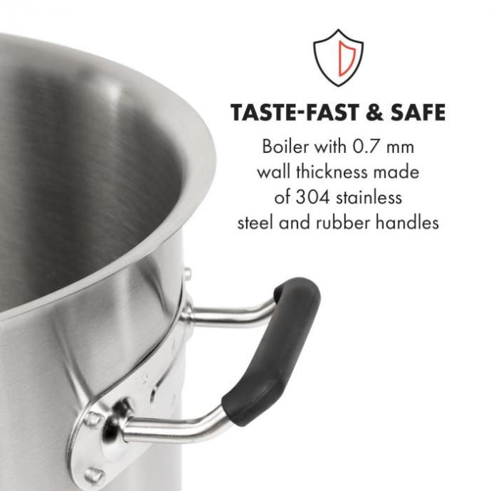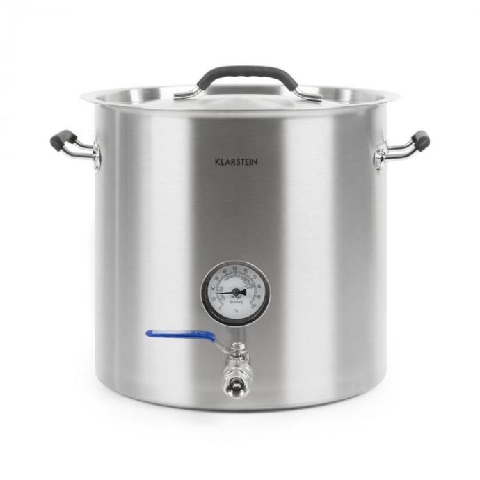 Užitak proizvodnje piva. Bilo svijetlo, bilo tamno, proizvedeno gornjim ili donjim vrenjem, pšenično ili pilsner, uz kotao za slad Klarstein Brauheld Pur 25 će laici, kao i majstori u proizvodnji piva, vrlo jednostavno izraditi ukusno domaće pivo.Kod upotrebe kotla za slad Klarstein Brauheld Pur 25 možete računati na svoje sposobnosti pripreme slada, imajući pri tome potpunu kontrolu nad procesom proizvodnje. Veliki kotao od nehrđajućeg čelika ima kapacitet 25 L. Stavite kotao na štednjak ili ploču za kuhanje i započnite. Nije potrebno dugo programiranje. Stijenka debljine 0,7 mm i dno debljine 3 mm osiguravaju optimalnu raspodjelu topline u kotlu. Uređaj je također prikladan i za indukcijske ploče. Kako bi se osiguralo tačno vrijeme kuhanja pojedinih koraka, na uređaju se nalazi lako čitljiv termometar s ekstrea dugim senzorom temperature.Za jednostavno točenje proizvedenog slada, kotao za slad Klarstein Brauheld Pur 25 ima na raspolaganju slavinu s priključkom za 1/2" crijeva. Gumene ručke na poklopcu i kotlu omogućuju jednostavno i sigurno rukovanje uređajem. Svi su dijelovi izrađeni od 304 nehrđajućeg čelika. Zato pivo neće poprimiti ni najmanji metalni okus, a nakon uporabe se jednostavno čiste.Svježe pivo iz vlastite domaće proizvodnje? Ne postoji ništa jednostavnije: uz kotao za slad Klarstein Brauheld Pur 25 svaki će hobist majstor u kuhanju piva posve lako izraditi pravo mlado pivo.Molimo, uzmite u obzir da se u Njemačkoj kuhanje piva mora prijaviti glavnome carinskom uredu.