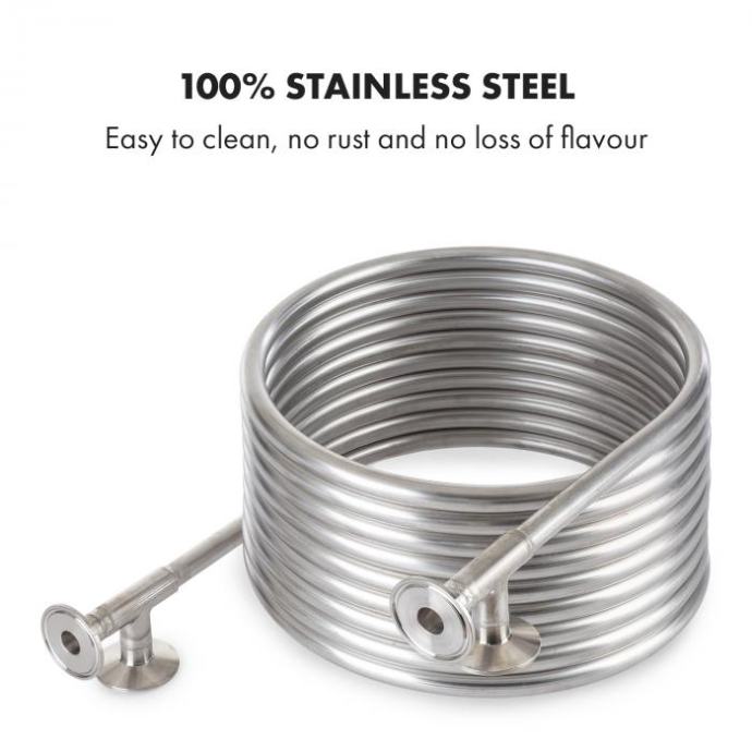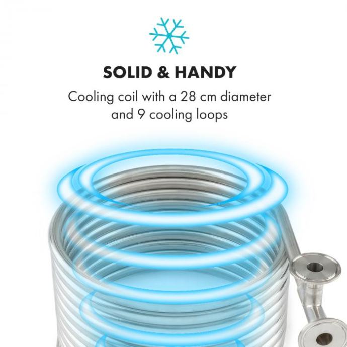 Ohladite slad za proizvodnju piva poput profesionalca! Spirala za hlađenje Counterflow tvrtke Klarstein hladi slad, zahvaljujući spiralnom dizajnu - ne samo da uklanja tanine, već pomaže i u odvajanju neželjenih komponenata od budućeg piva. Kroz spiralu teče vrući slad u jednom smjeru, dok rashladna voda teče u suprotnom smjeru u rashladnom plaštu iznad spirale. Zahvaljujući dizajnu od nehrđajućeg čelika 304, spriala jamči apsolutnu neutralnost okusa i vrlo se lako čisti.Napominjemo da su za učinkovitu uporabu potrebni i drugi dijelovi (npr. crijevo i crpka), koji nisu uključeni u sadržaj paketa.