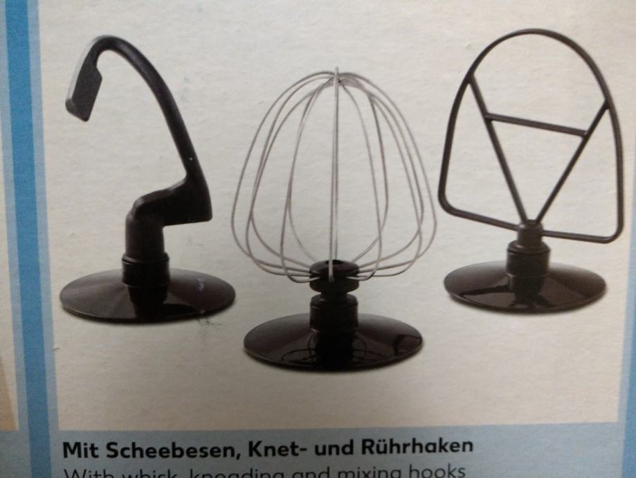 Kuhinjski mikser s posudom i tri vrste nastavaka za miješanje,