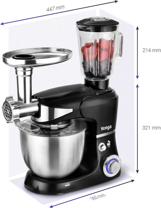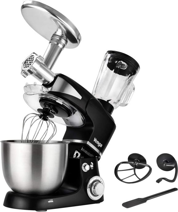 VENGA MULTIFUNKCIONALNI SAMOSTOJEĆI MIKSER s ravnom mutilicom za svakodnevnu upotrebu, kukom za tijesto za miješanje teškog tijesta (poput tjestenine ili kruha) i balonom za mućenje velikom brzinom (beza ili vrhnja), ali dodatno opremljen blenderom i dodatkom za mljevenje mesa , idealan za izradu kobasica i ćevapa. Sa šest brzina i snažnim motorom od 1000 W prikladan je za bilo koju vrstu pripreme. Pokret mješalica osigurat će da se svi sastojci pomaknu natrag u središte zdjele za optimalno glatko miješanje što rezultira idealnim i dobro izmiješanim tijestom.