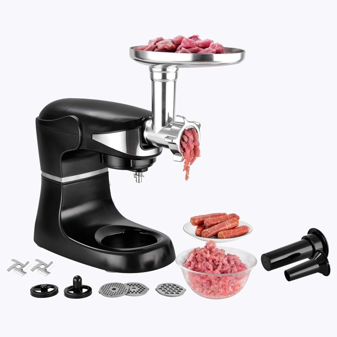 UKLJUČENO: jedan stalak za miješanje, jedna zdjela od pet litara od nehrđajućeg čelika, jedna pjenjača od nehrđajućeg čelika, jedna ravna metlica, jedna kuka za tijesto, jedna lopatica, jedan blender od 5 litara, jedan mlin za meso s tri diska za rezanje, pribor za kobasice i sl., jedna knjiga recepata. 1000W