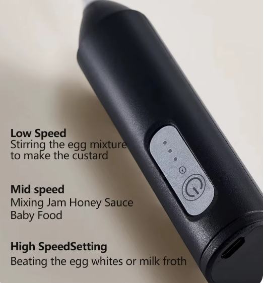 s tri postavke brzine (niska, srednja, visoka), ova bežična mutilica za jaja zadovoljava različite kulinarske potrebe: niska za nježnu kremu, srednja i visoka za brzo pjenasto mlijeko.