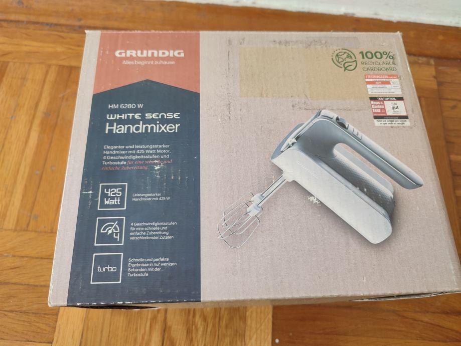 Prodajem nov, nekorišten, ručni mikser Grundig HM 6280 W iz linije White Sense. Radi se o mikseru snage 425 W, s 4 stupnja brzine i turbo funkcijom. Dolazi s nastavcima za mućenje. Nije korišten.