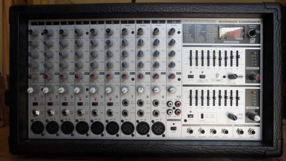Profesionalna aktivna mikseta Behringer Europower 2000 sa 10 kanala, sa izvrsnim stereo digitalnim efektima studijske kvalitete i velikom ukupnom snagom od 500 W. Na miksetu je moguće spojiti više mikrofona, glazbenih instrumenata i drugih uređaja za reprodukciju zvuka i pogodna je kako za nastupe u živo, tako i za snimanje u studiju, doma i za druge namjene. Inače, mikseta ima mnoštvo naprednih funkcija kao dupli master 9-band graphic equalizer sa FBQ sistemom detekcije mikrofonije, IMP mikrofonska predpojačala i drugo, a mikseta nije korištena za javne nastupe, samo je isprobana pa je praktički kao nova.