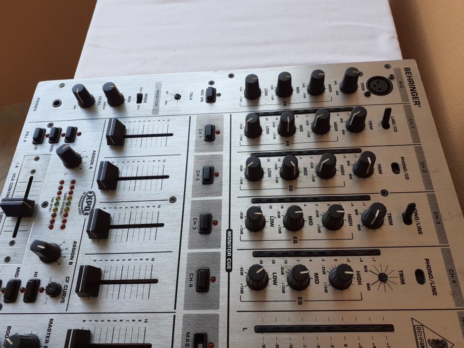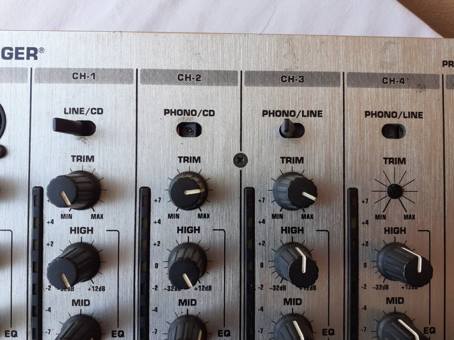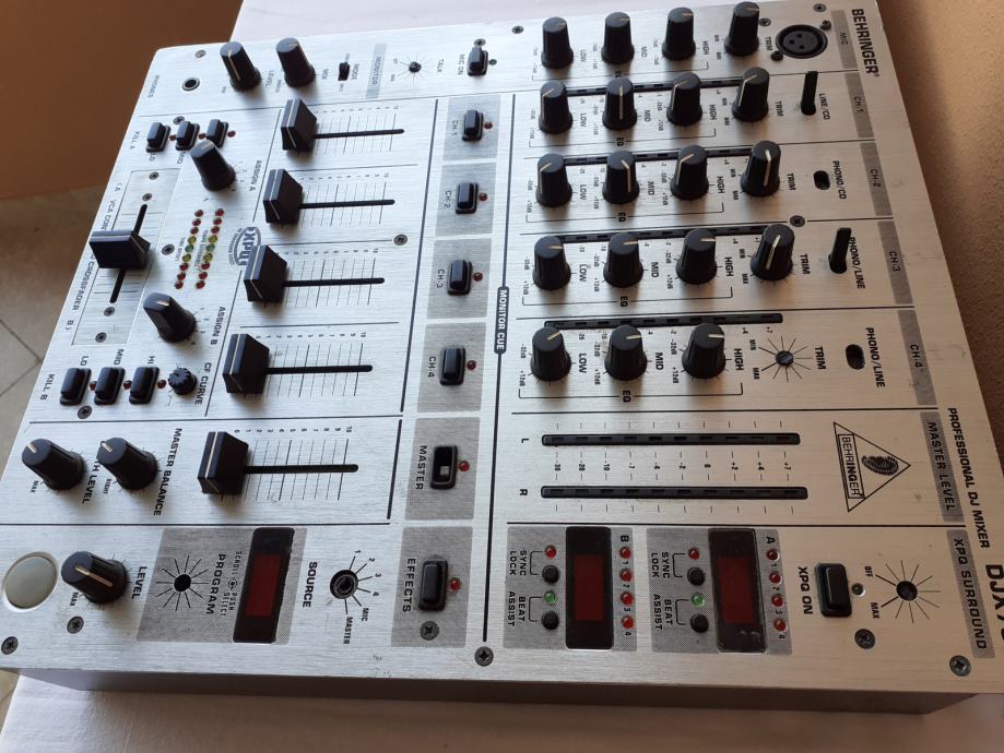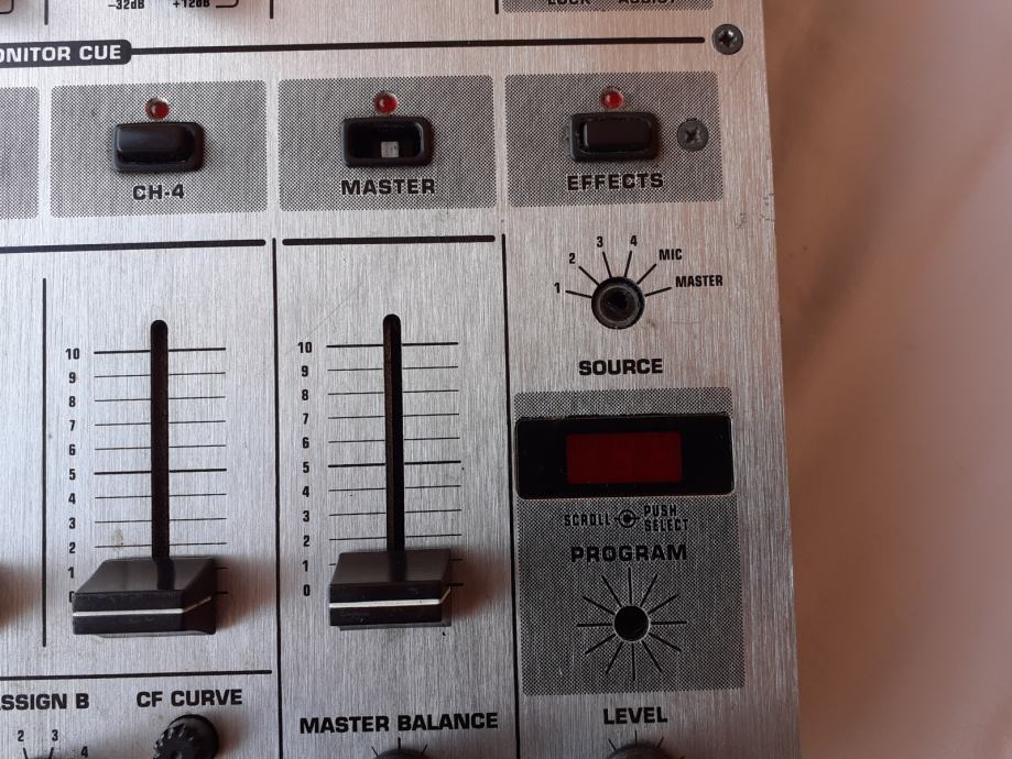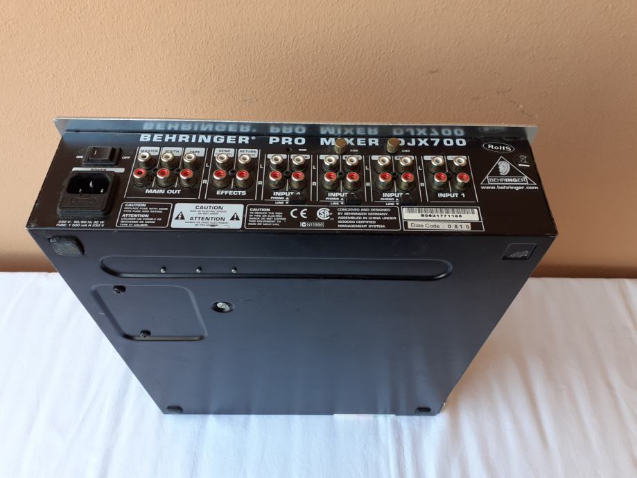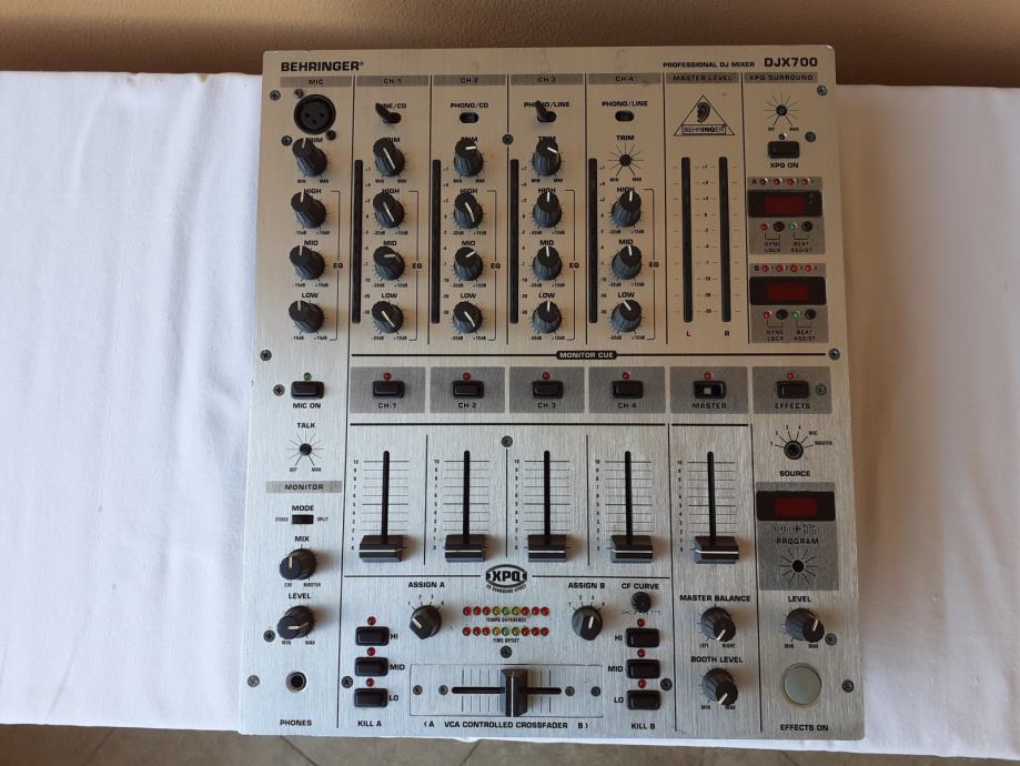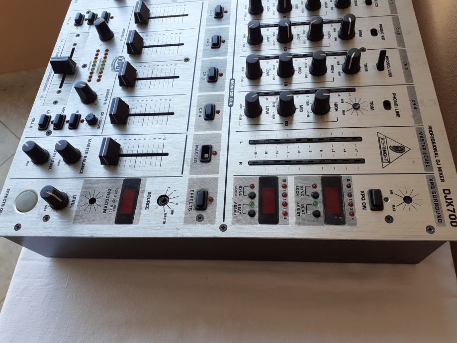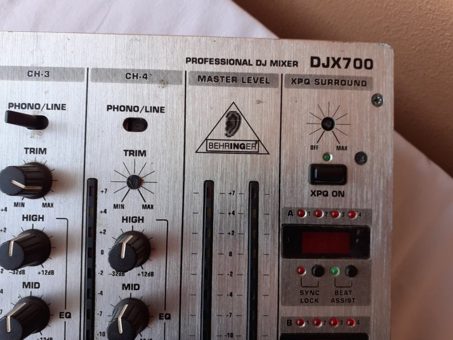 Prodajem miješalicu Behringer DJX700, na kojoj su mnogi dijelovi neispravni. Uredno prima signal preko prvog i drugog kanala i svi potenciometri na prvom i drugom kanalu, kao i level-metri uz njih rade normalno, ali ne prima zvuk preko 3. i 4. kanala. Sklopke za isključenje i uključenje pojedinih kanala, kao i ona za isključenje master izlaza ne rade, tj. svi kanali su stalno uključeni i nije moguće pritiskom na te tipke isključiti pojedini kanal. Cross fader potenciometar ne utišava ono što na njega ulazi preko ulaza B. Nekoliko ručica sklopki i kapica potenciometara je slomljeno, jedan gumb nedostaje, ali svime time se može upravljati npr. odvijačem (šarafcigerom). Izlaz za slušalice radi normalno, dok sve ostale funkcije kojima se upravlja putem sklopki, gumbova, i potenciometara koji su uz lijevi rub uređaja nisu provjerene. Sve funkcije kojima se upravlja putem sklopki, gumbova, i potenciometara koji su uz desni rub uređaja također nisu provjerene. Nisam provjerio ni booth potenciometar niti booth izlaz. Sve ovo što nisam provjero zapravo nisam provjerio jer ne znam kako to koristiti, a nemam mikrofon sa canon konektorom da provjerim ulaz za mikrofon.