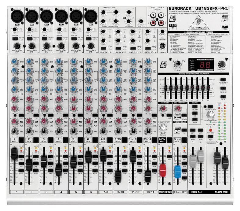 Behringer EURORACK UB1832FX-PRO dizajn s ultra niskim šumom, 18 ulaza, 3/2 sabirnice mikrofon/linijski mikser s vrhunskim mikrofonskim pretpojačalima i multi-FX procesorom