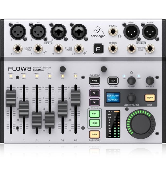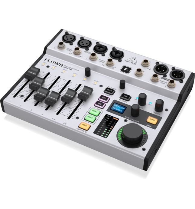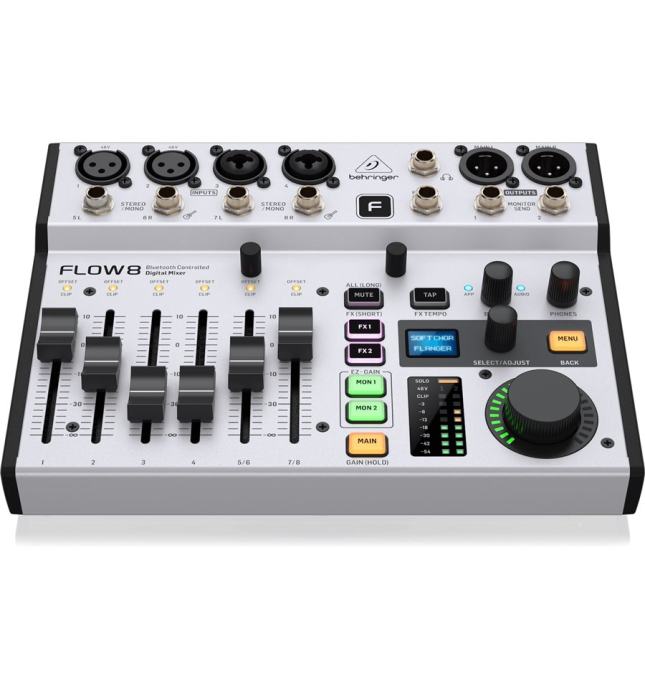 Behringer Flow 8 je kompaktni digitalni mikser koji je prilagodljiv širokom rasponu aplikacija zahvaljujući svojoj maloj veličini i širokom spektru funkcija. Sve njegove postavke mogu se spremiti i pozvati kasnije. Jedinicom se može upravljati daljinski putem namjenske aplikacije, a također ima dodatnu traku kanala za primanje vanjskih audio signala putem Bluetootha. Flow 8 ima ukupno šest traka kanala, od kojih su dvije stereo, čime ukupan broj kanala iznosi 8 – otuda i njegovo ime. Svaka traka opremljena je EQ dijelom i kompresorom. Njegova mala veličina i jednostavan i pouzdan rad čine Flow 8 prikladnim za širok raspon različitih postavki – bilo na pozornici, u prostoriji za probe ili čak ugrađen u konferencijski zvučni sustav.