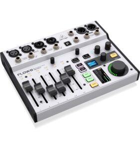 Behringer Flow 8 je kompaktni digitalni mikser koji je prilagodljiv širokom rasponu aplikacija zahvaljujući svojoj maloj veličini i širokom spektru funkcija. Sve njegove postavke mogu se spremiti i pozvati kasnije. Jedinicom se može upravljati daljinski putem namjenske aplikacije, a također ima dodatnu traku kanala za primanje vanjskih audio signala putem Bluetootha. Flow 8 ima ukupno šest traka kanala, od kojih su dvije stereo, čime ukupan broj kanala iznosi 8 – otuda i njegovo ime. Svaka traka opremljena je EQ dijelom i kompresorom. Njegova mala veličina i jednostavan i pouzdan rad čine Flow 8 prikladnim za širok raspon različitih postavki – bilo na pozornici, u prostoriji za probe ili čak ugrađen u konferencijski zvučni sustav.