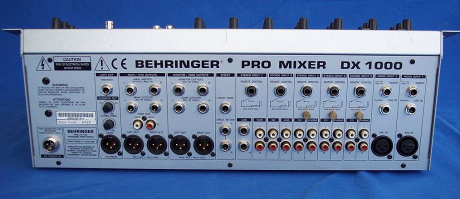 DX1000 ima pet dual stereo ulaza, omogućujući vam da odaberete između ukupno deset različitih stereo izvora, plus dva dodatna mono mic / line kanala s diskretnim ULN mic preamps i line ulaza. Svih sedam kanala sport steći kontrolu, djelotvoran i glazbeni 3-band EQ s low-end gumbom i bypass funkcijom za jednostavne usporedbe, plus PFL (Pre-Fader slušanje) i super-glatko 100-mm studio kvalitete faders . Osim toga, svaki kanal nudi kontrolu strojeva za daljinsko pokretanje gramofona, CD / MD playeri itd. mic / line kanali dodatno značajka aux poslati za vanjske procesore, kao i pločice.