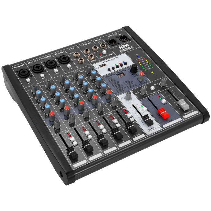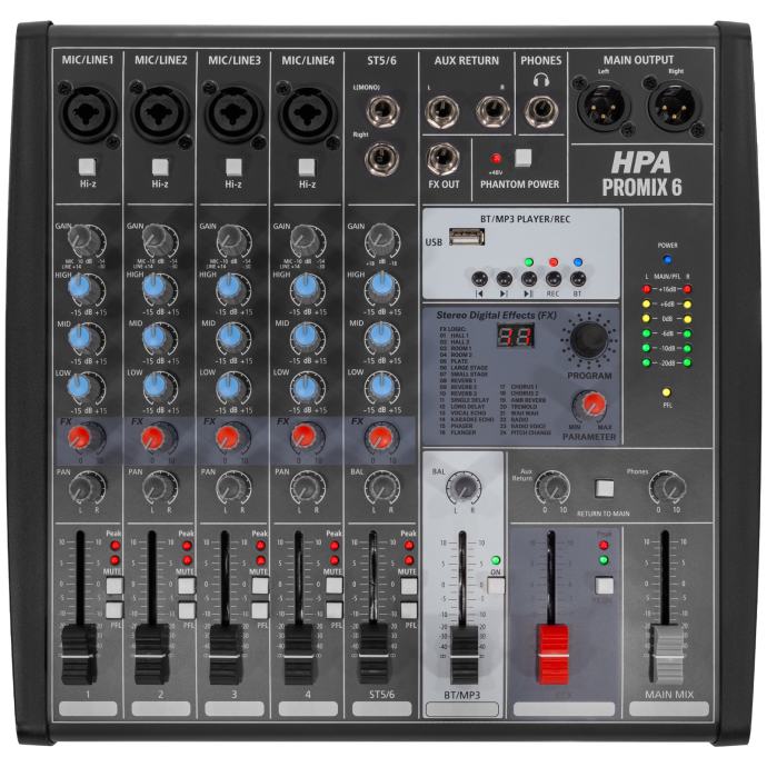 The HPA Promix 6 is a compact 6-channel analog mixing console featuring multi-effects, USB 2.0 connectivity and Bluetooth.