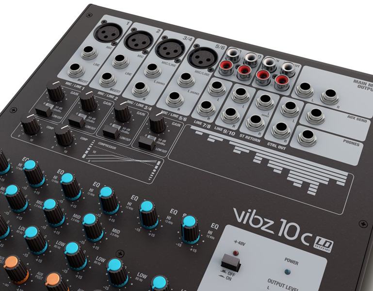 VIBZ 10 is a versatile mixer with four balanced microphone inputs featuring high quality preamplifiers, a low-cut filter and switchable phantom power. Two microphone inputs are equipped with inserts for individual signal processing, two more can alternatively be used as stereo line channels