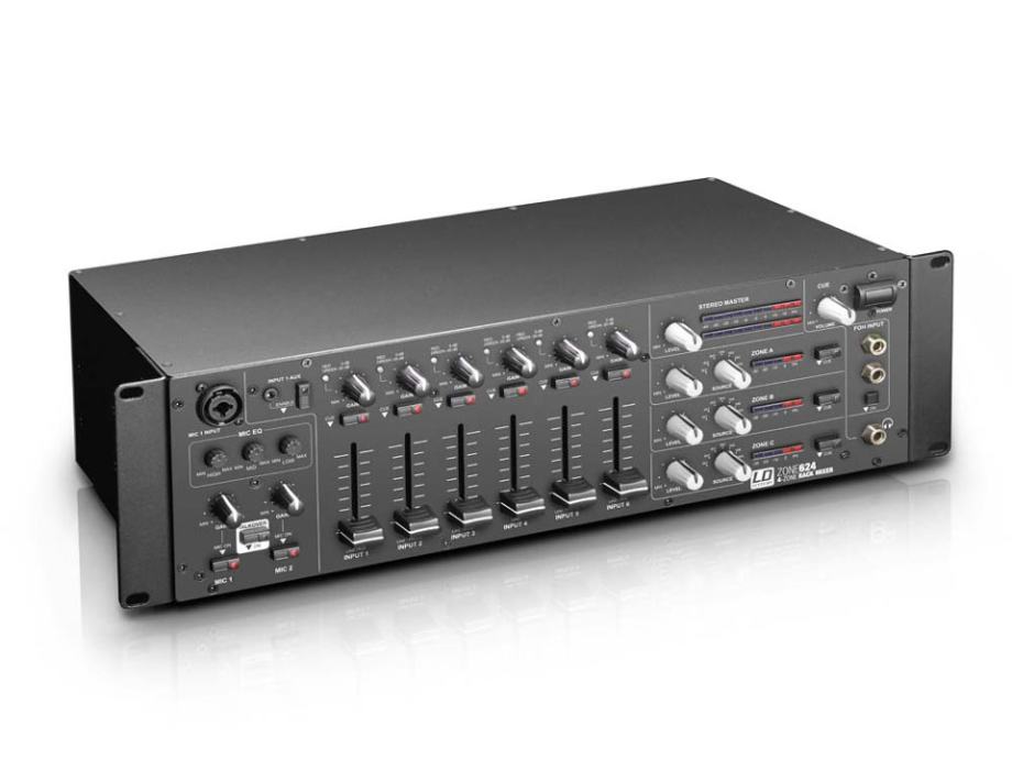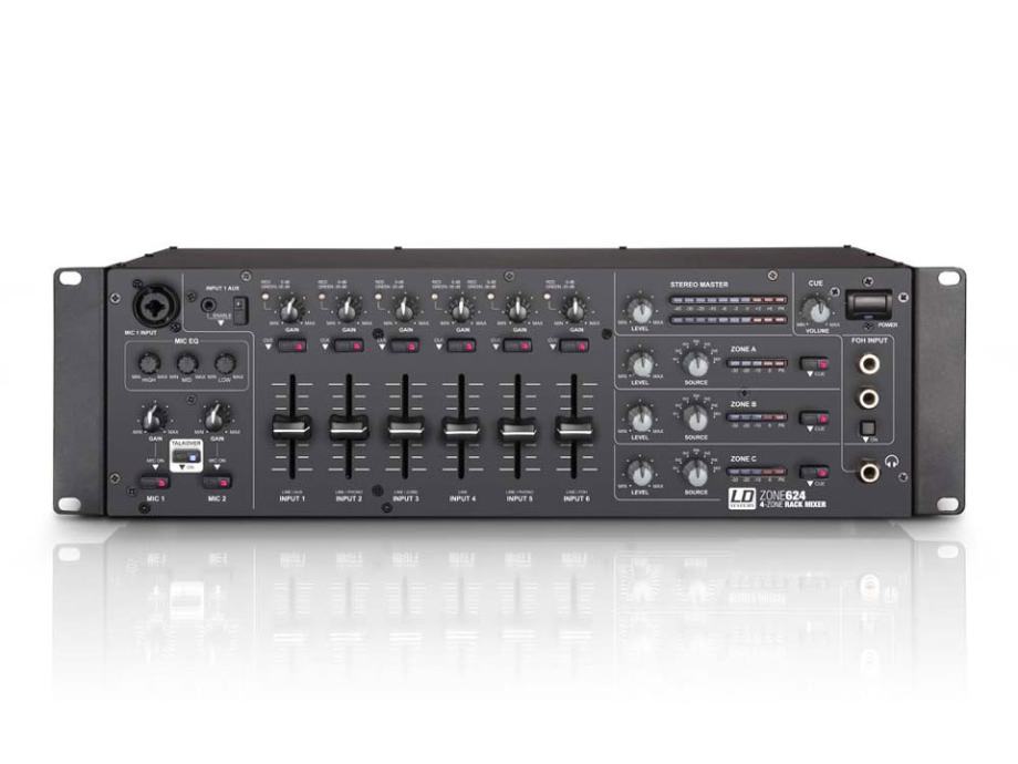 Potpuno opremljeni zonski mikser sa 6 linija i 2 mikrofonska kanala koji se mogu zadužiti na stereo ili mono master izlaz. Ovaj kompaktni 3U rack uređaj također sadržava ulaze za vanjski hitni najavni sistem i za daljinski kontroliranu selektivnu “mute” funkciju. Zahvaljujući svojoj proširenoj povezivosti ZONE 624 je izuzetno fleksibilno kontrolno centralno rješenje za PA sisteme u restoranima, klubovima, hotelima, fitnes centrima, itd.