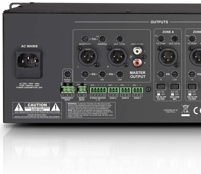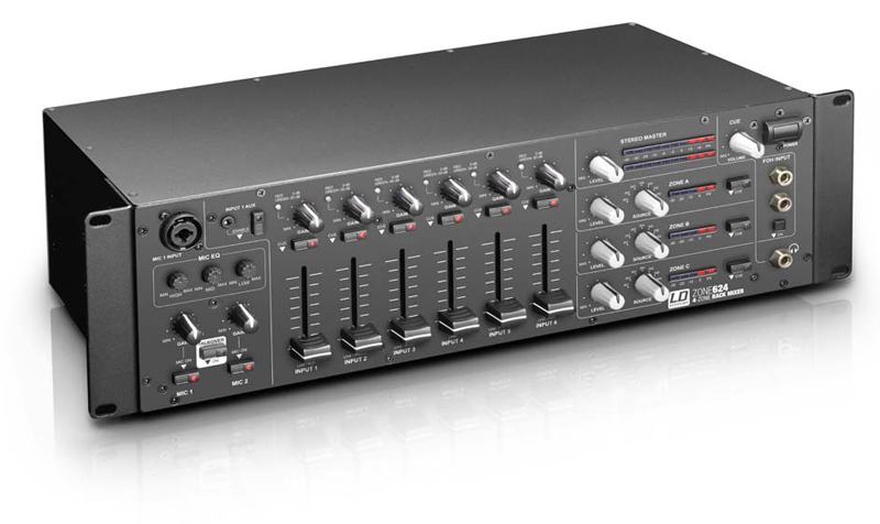 The ZONE 624 is a fully-equipped zone mixer with 6 line and 2 microphone channels, that can be assigned to a stereo or a mono master output. The compact 3U rack device also has inputs for an external emergency announcement system and remote- controlled switching mute. Due to its extensive connectivity the ZONE 624 is the extremely flexible control centre solution for PA systems in food outlets, clubs, hotels, fitness centres, and many other areas.