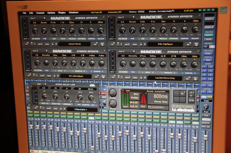 Mackie d8b v. 5.0, digitalna studijska mikseta sa 4 x 8 optičkim digitalnim interfejsima (32 digitalna kanala), 24 analogna ulaza i izlaza i efekt procesorima (2 MFX multieffect cards i 1 UFX cards - TC Electronics M2000). Svi faderi motorizirani i rade. Popis otključanih pluginova je vidljiv na slikama. U cijeni je i eksterni monitor, tipkovnica, miš, svi kabeli i originalni sistem tj. sve potrebno za momentalno puštanje u pogon. Pult radi i bez monitora jer su sve funkcije vidljive na ugrađenom displayu pa ga je moguće koristiti i na terenu. Moguće zamjene za profesionalnu studijsku opremu više klase (mikrofoni, predpojačala....)