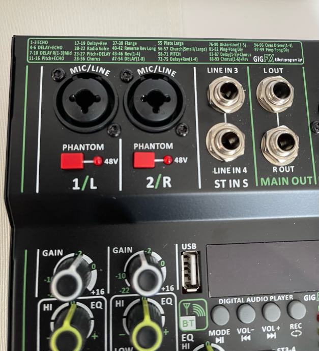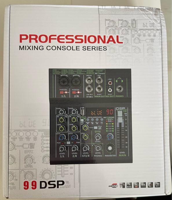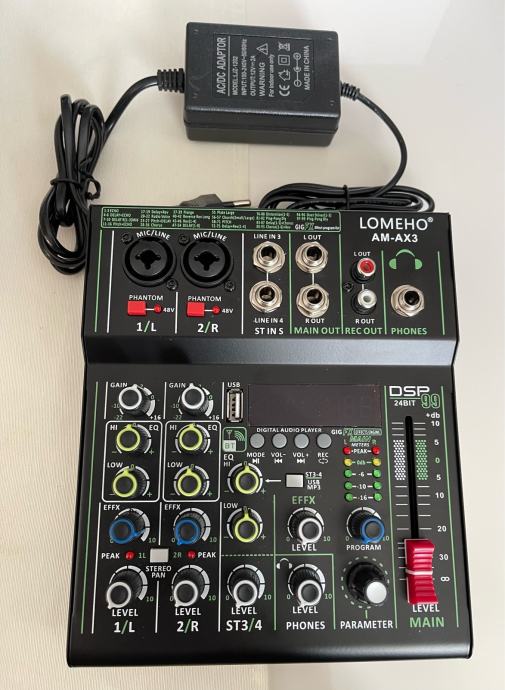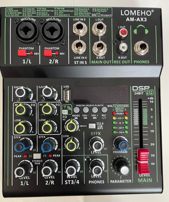 Prodajem 4 kanalnu miksetu LOMEHO opremljenu sa FX procesorom sa 99 efekata, kombiniranim XLR/banana ulazima, phantom power po kanalu, USB/bluetooth player sa mogućnosti snimanja i kontrolom glasnoće te izlazom za slušalice sa kontrolom glasnoće.