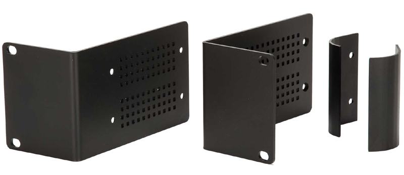 Rack mount accessories for M 18 mixers. Rack mount ears are used to substitute the M 18’s plastic side panels and allow the installation of the M 18 with the connector panels either on the inside or the outside part of the rack.