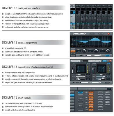 Mala digitalna konzola s "flying" klizačima i kontrolom preko iPad-a. Studiomaster je upravo lansirao digiLiVE 16, kompaktni digitalni audio mikser koji koristi hibridni koncept koji kombinira prednosti hardverske/kontrolne površine ekrana osjetljivog na dodir i daljinskog rada tableta. DigiLiVE 16 je 16 ulazni/16 sabirnica/8 izlazni mikser s kontrolnom površinom koja integrira 7-inčni Android-driven touchscreen visoke rezolucije i osam motoriziranih 100 mm fader operacija, zajedno s potpuno daljinskim (iOS i Android) tablet operacijama. AD/DA konverzija je 24 bit / 192 kHz. 16 ulaza uključuje 12 ulaznih kanala za mikrofone, a postoji i do osam internih efekt bus-eva s reverbom, delay, 15-pojasnim EQ i modulacijom. Izlazi takođe uključuju digitalni AES / EBU i SPDIF. Postoje dva USB sučelja (prednji i zadnji panel) koji podržavaju reprodukciju i snimanje, spremanje scene i ažuriranje sistema. WiFi i Bluetooth bežična veza su podržani.