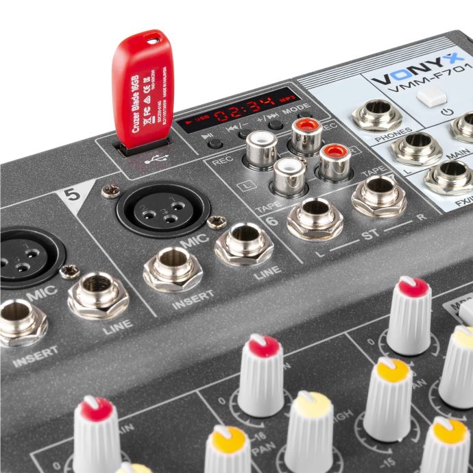 7-channel live stage mixer with echo effect and a USB input for MP3 playback. Comes with a stereo Effect (Jack) connection for external effect processor. Suitable for bands, studio and stage applications.