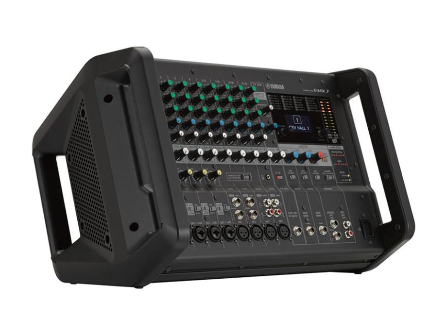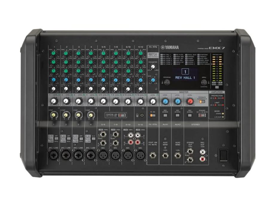 Spakiran u robusno i kompaktno kućište, mikser Yamaha EMX7 osigurava i vrhunsku kvalitetu zvuka. Sadrži osam mikrofonskih pretpojačala s fantomskim napajanjem, a na svakom od 12 ulaza EMX7 ima 3-pojasni EQ za korekciju zvuka. Na četiri ulaza su smješteni Yamahini popularni kompresori kojima se putem samo jednog potenciometra izjednačava dinamika ili “nabrijava” zvuk. 9-pojasni grafički ekvalizator prilagođava vaš cjelokupni zvuk prema akustičkim uvjetima svirke. Efekti daju dodatnu dimenziju vašoj izvedbi ili prezentaciji, a Yamahin feedback suppressor se brine da svaki koncert prođe bez nepoželjne mikrofonije. Yamaha powered mikser EMX7 sa svojom snagom od 710 W u D klasi dovoljno je izdržljiv za pouzdan rad tijekom više godina.