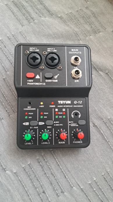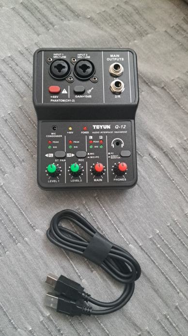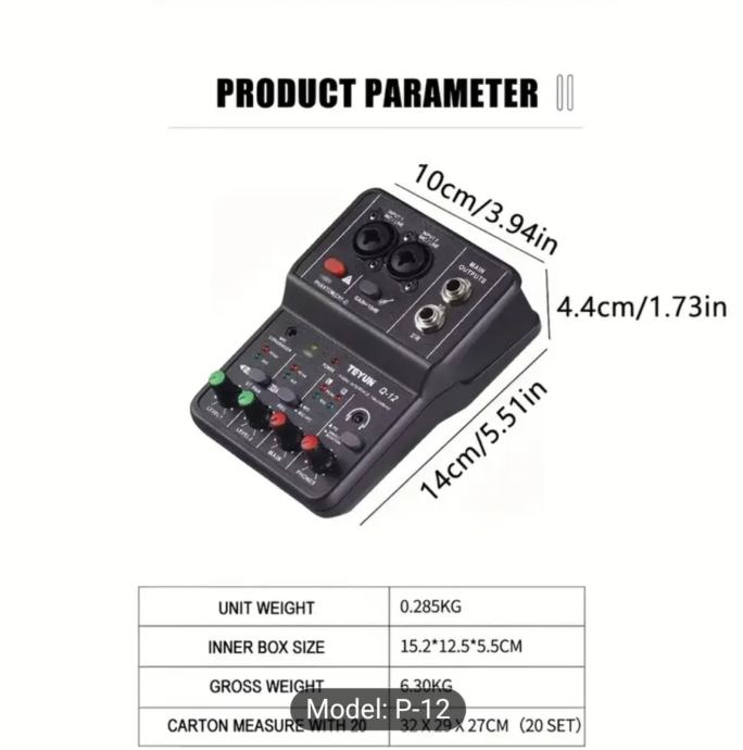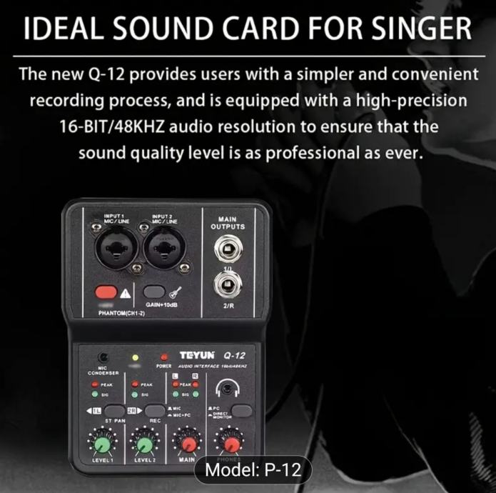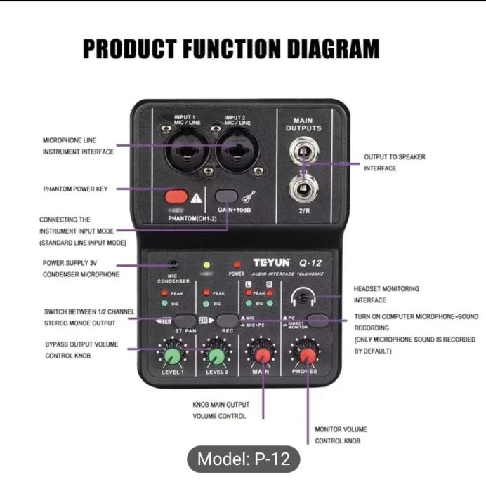 BOMGE Q12 2-kanalna prijenosna audio interfejs - profesionalni mini USB mikser za gitaru, vokale i snimanje u studiju, 36V ili manje, crni ABS materijal, 2 kanala, 2 kanala audio interfejs | Kompaktni mikser | Izdržljiv dizajn