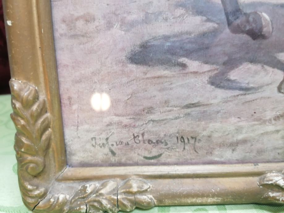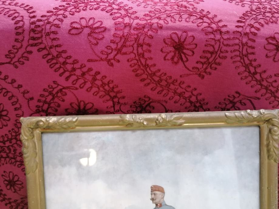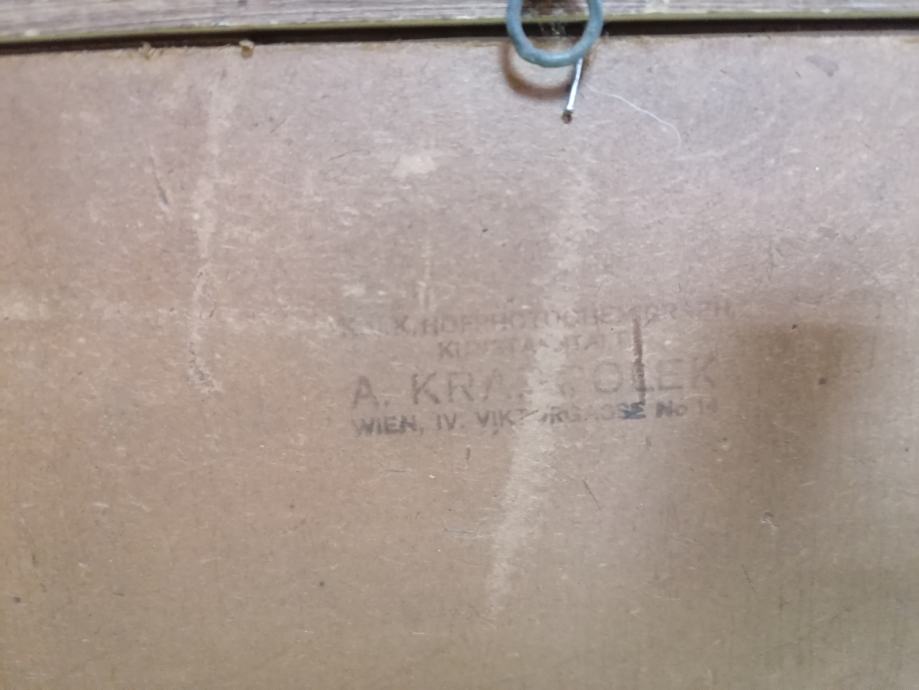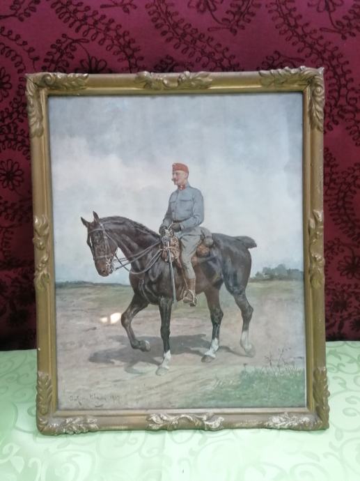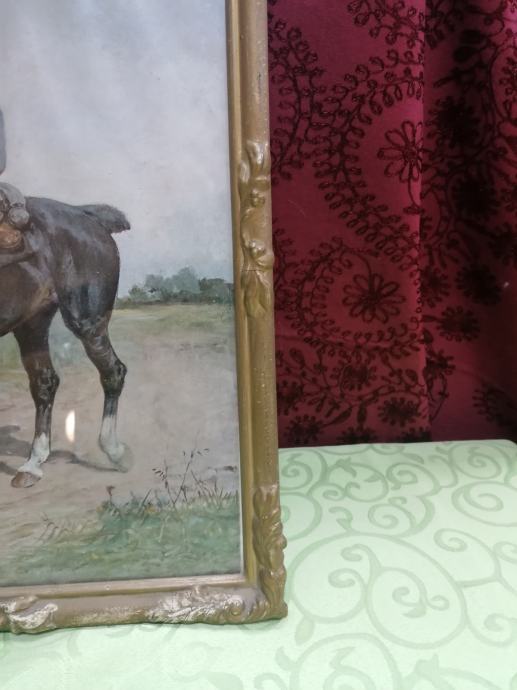 Dakle, predivna slika Austrougarskog časnika na konju. Potpisana, 1917. godina. Odostraga žig uramljivača, Beč. Prekrasan secesijski okvir, ostakljeno. Dimnezije 38,5x31x5 cm. Pravi kolekcionarski predmet. Dobijete predmet sa slika.