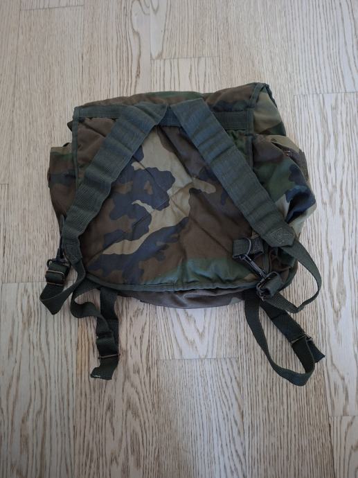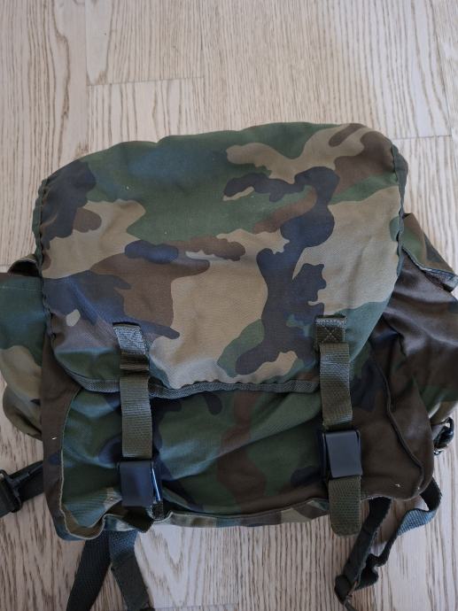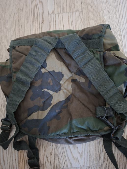 Borbeni ranac (ruksak) HV iz Domovinskog rata. Woodland camo. Plastične kopče. Sastoji se od četiri pretinca. Na donjem dijelu su vezice za šatorsko krilo. Očuvanost i stanje su vidljivi na fotografijama. (-1)