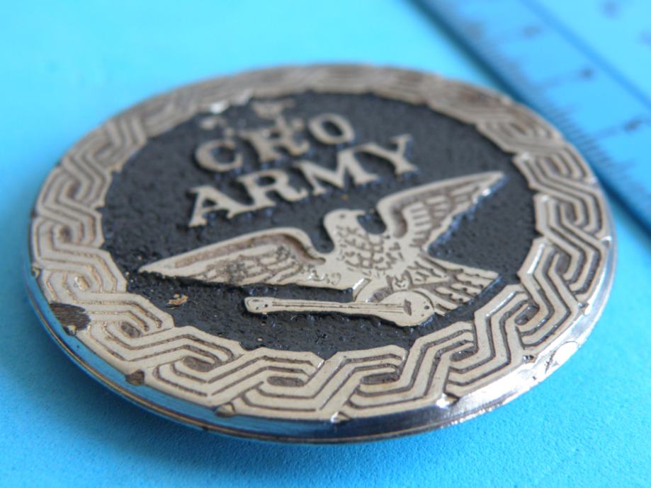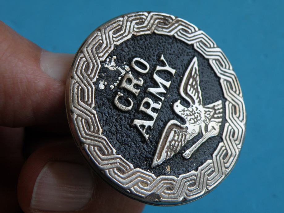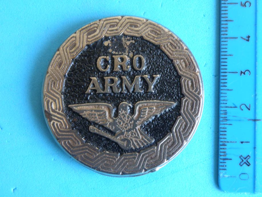 Oznaka je izrađena iz tiješnjenog poniklanog lima koji je obojan crnom lak bojom. Na znaku se može isčitati tekst : " CRO ARMY " .