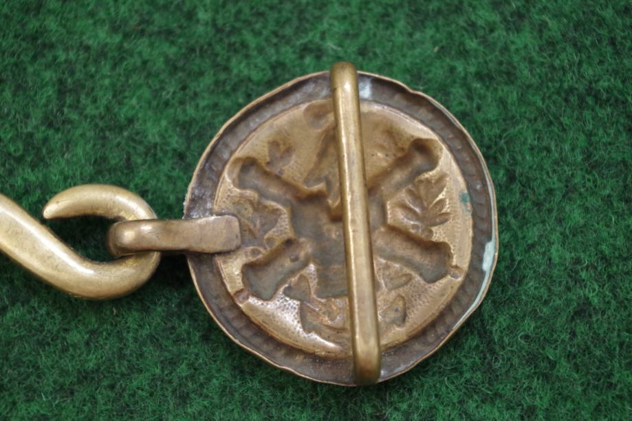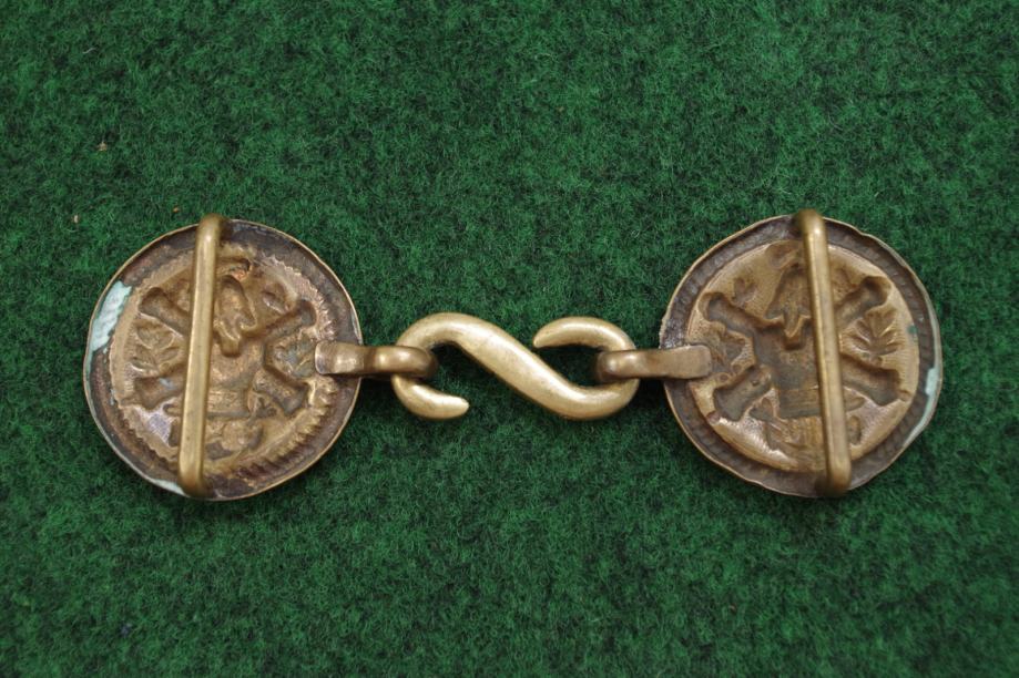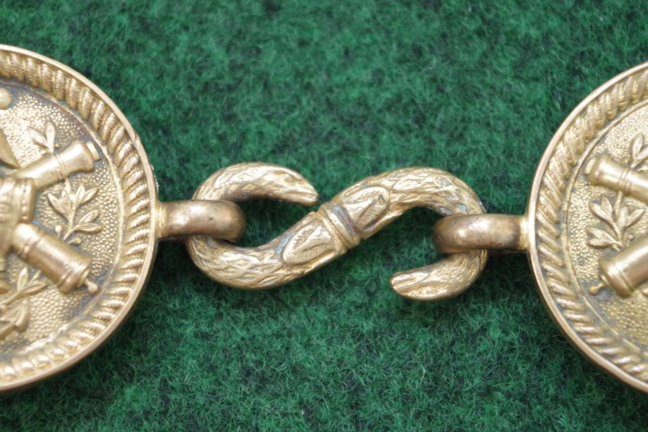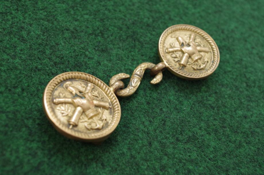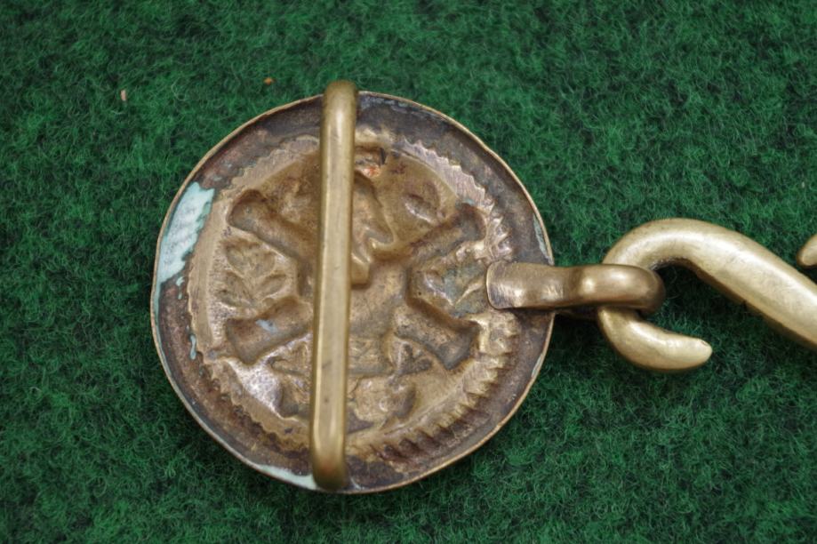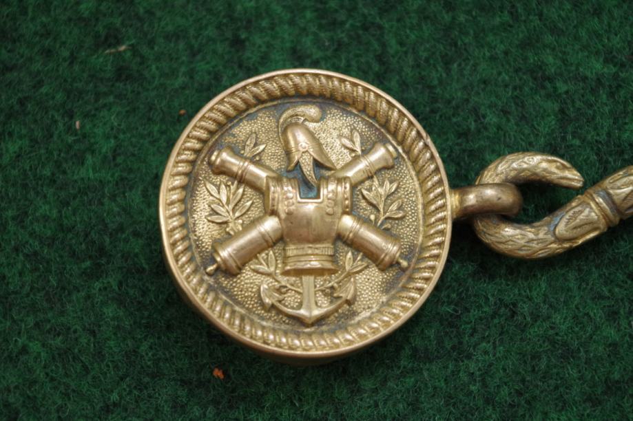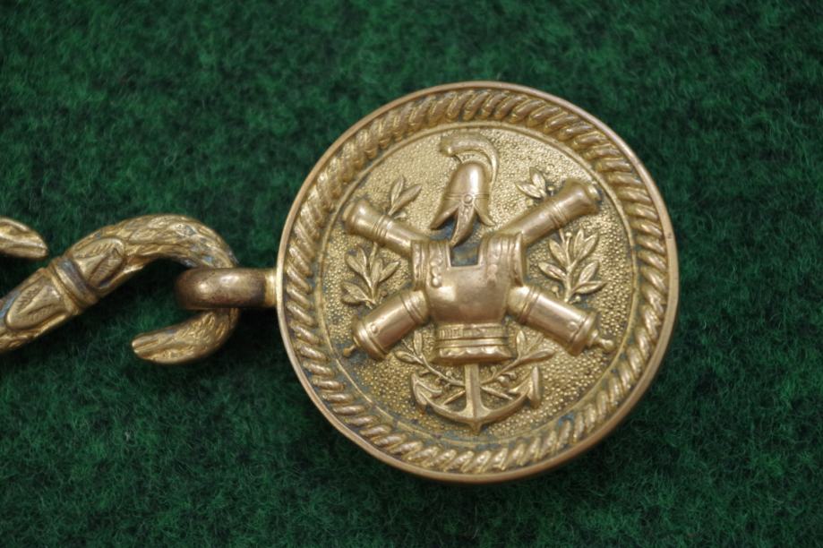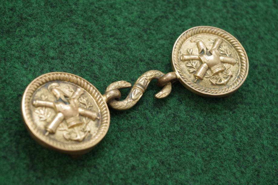 Pozlaćena mjedena kopča sa urisnutim motivima topova, sidra, kacige i prsnog oklopa
