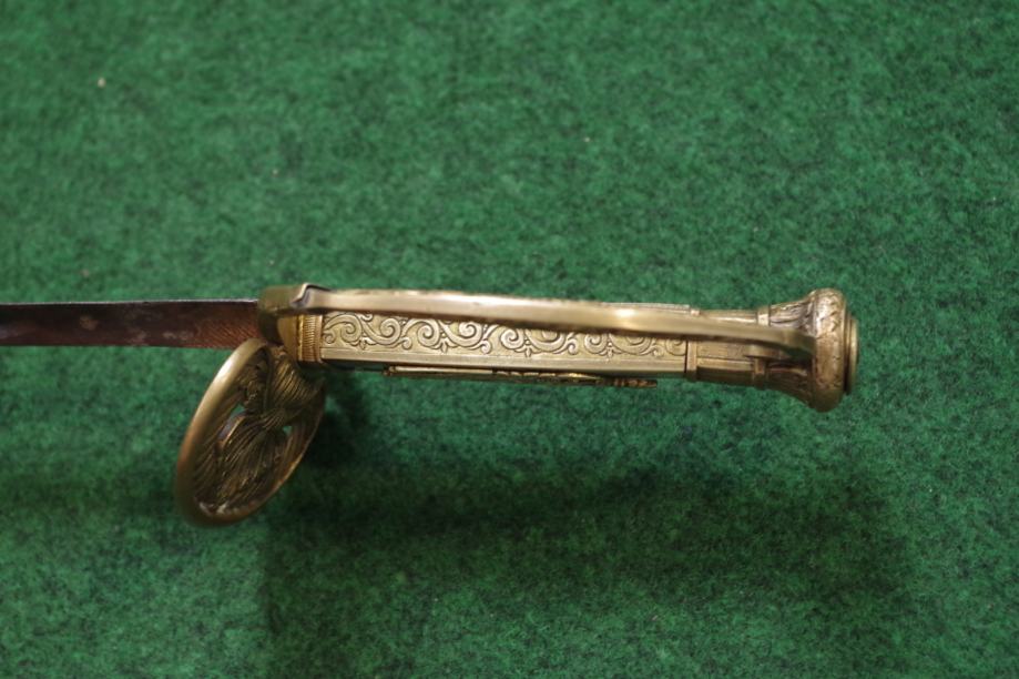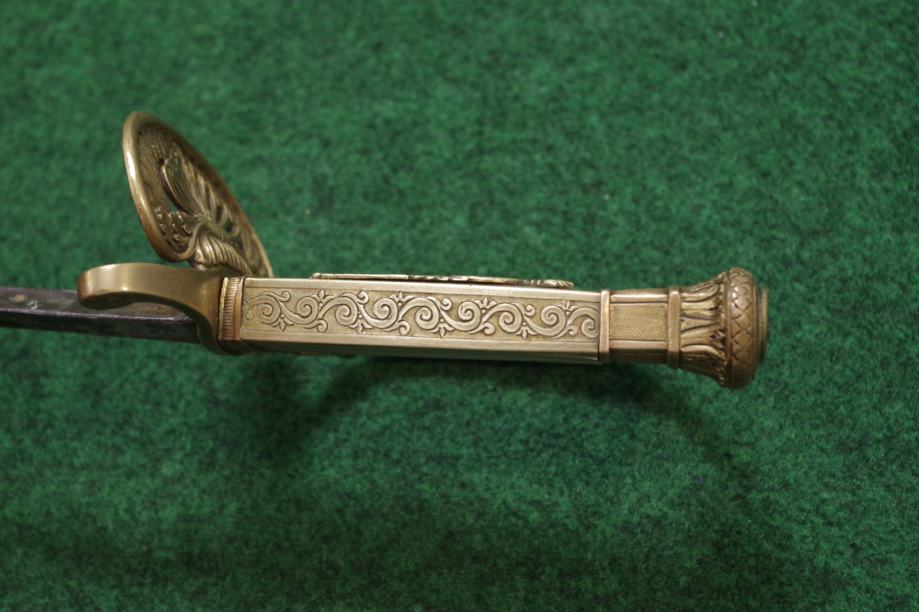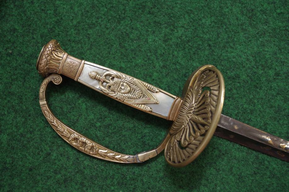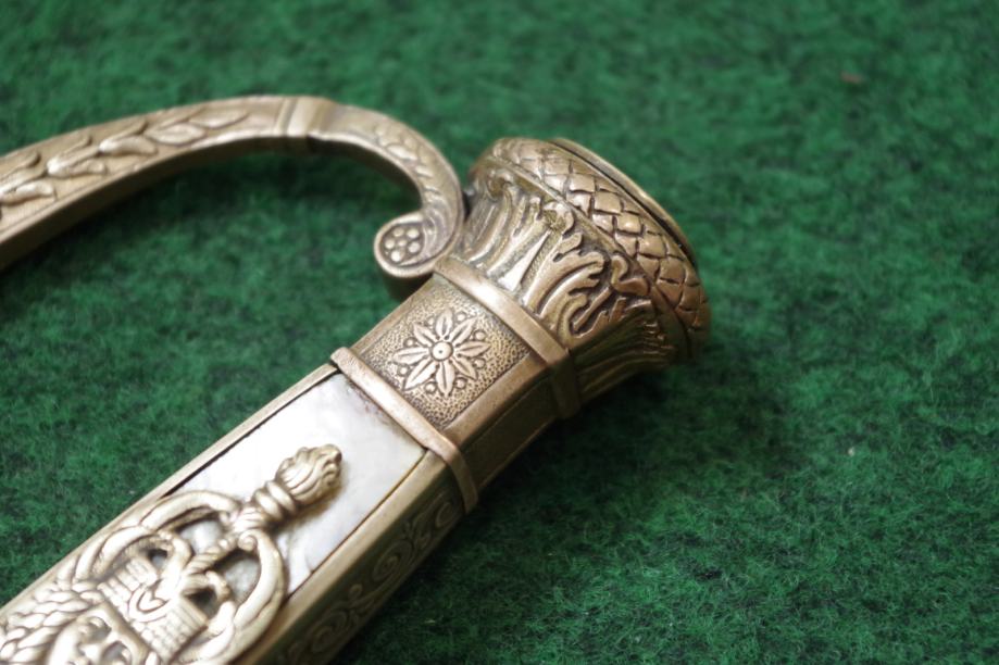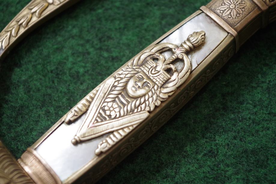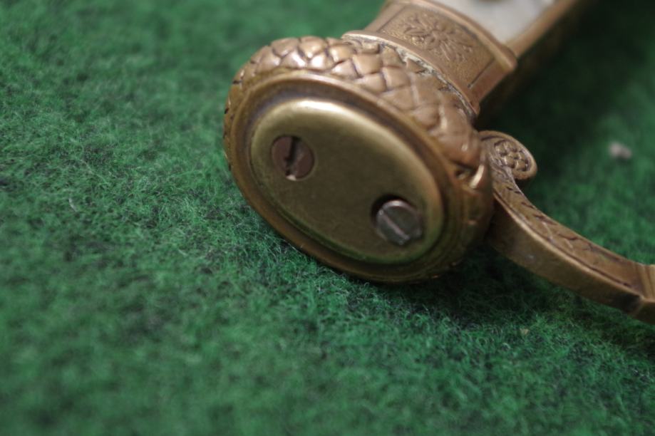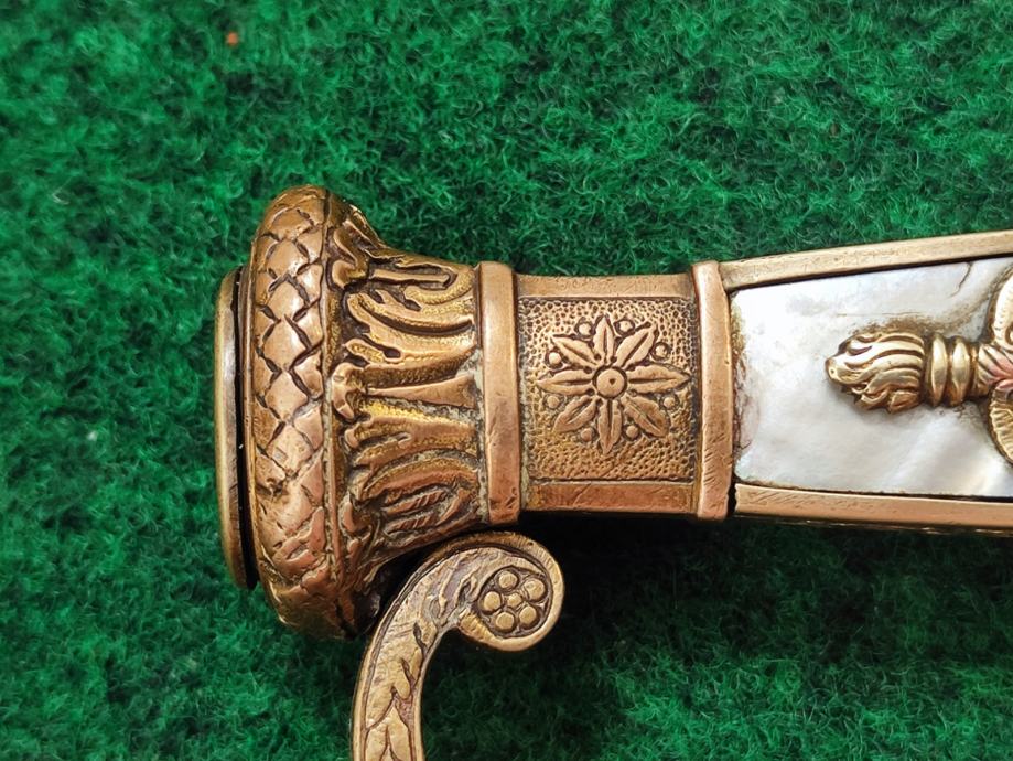 Na prednoj strani drške obloga od sedefa i mjedena aplikacija egipatskog božanstva