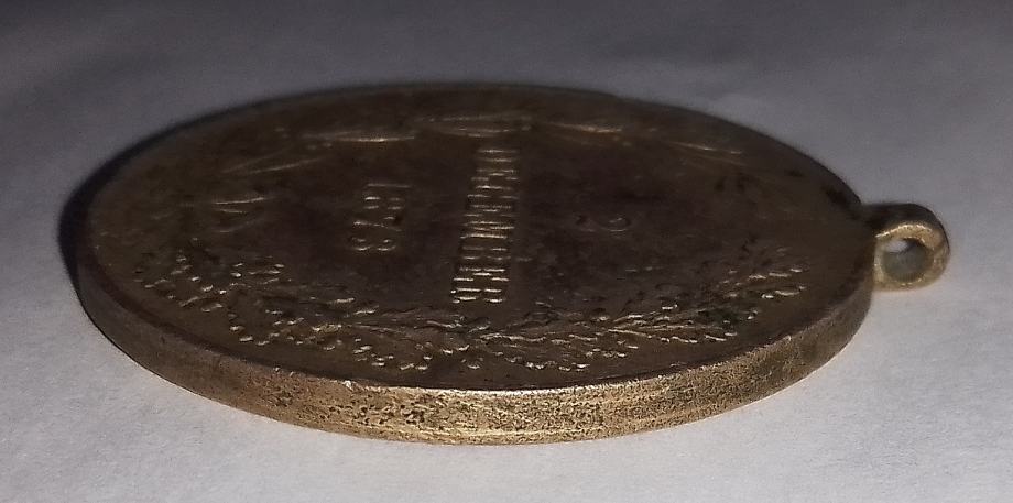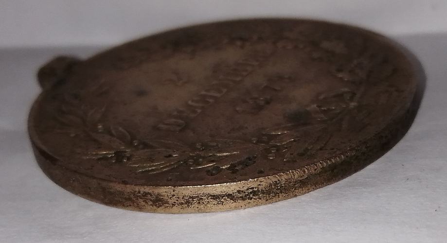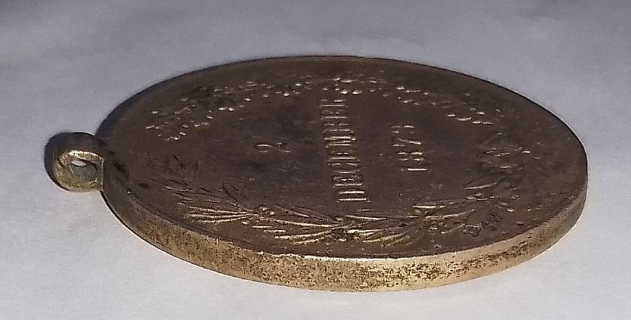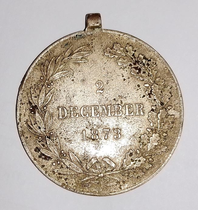 Naličje: Unutar uzdignutog oboda nalazi se vijenac sastavljen od grane lovora s lijeve i hrastove grane s desne strane, koji je pri dnu vezan mašnom. Unutar vijenca nalazi se natpis u tri retka koji glasi 2. DECEMBER 1873.