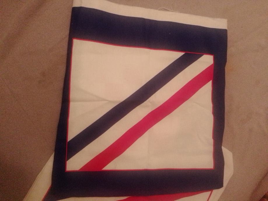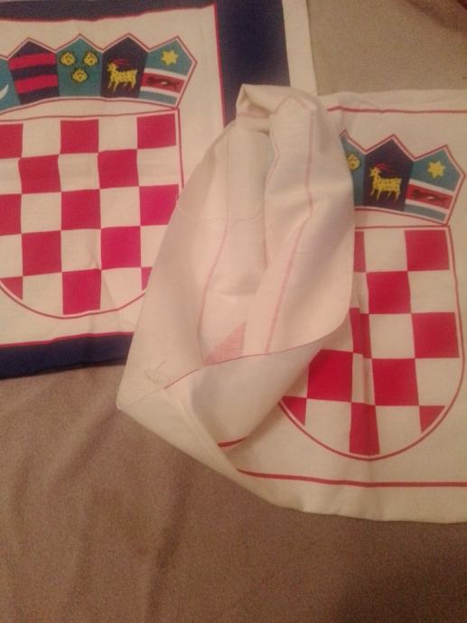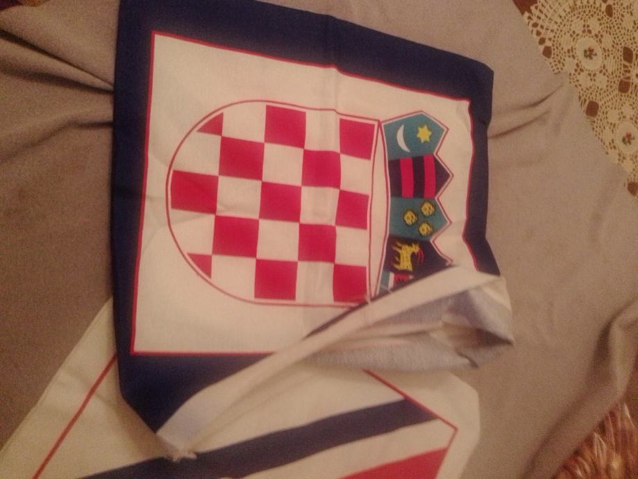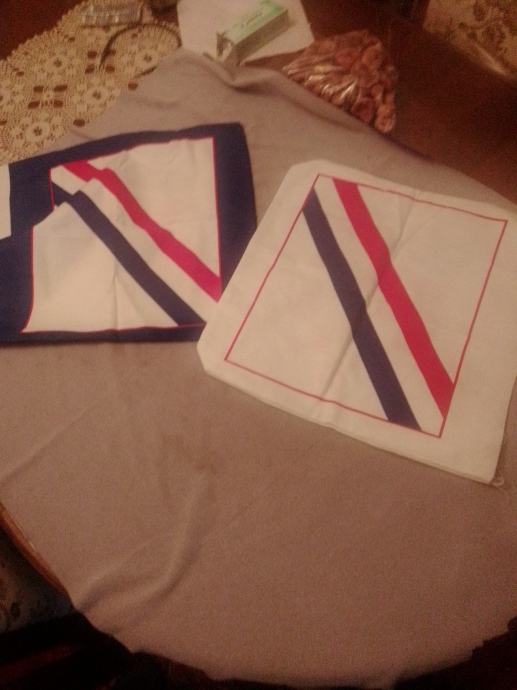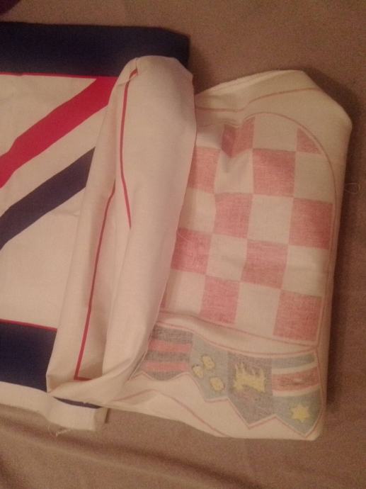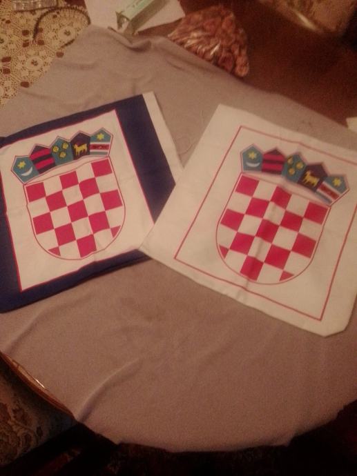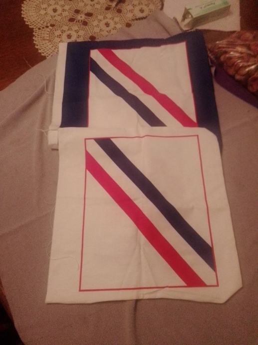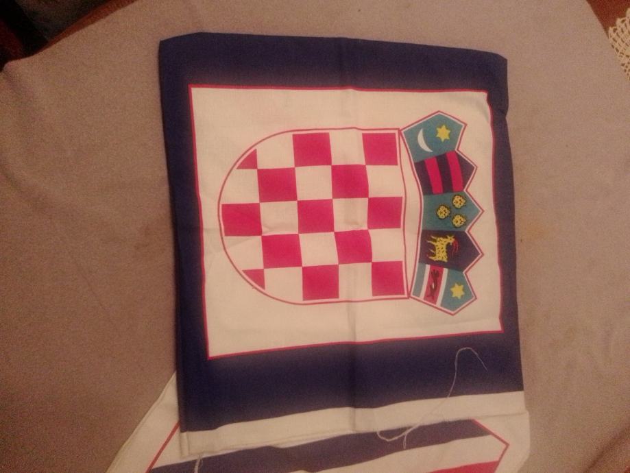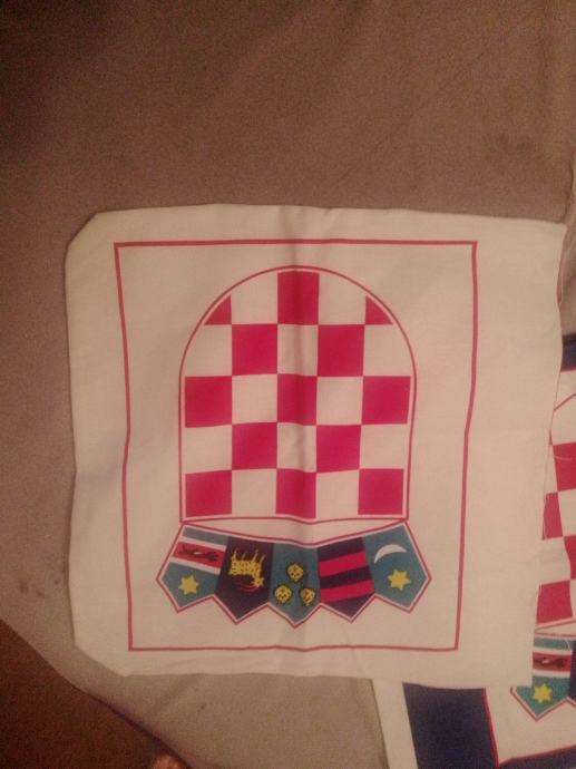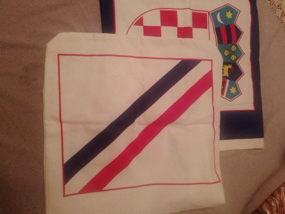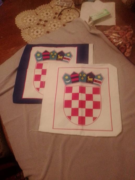 38*38cm pamučna navlaka (za jastuke ili torbe ili grbovi zastava)s jedne strane trobojnica a s druge grb u plavoj i bijeloj podlozi.Šaljem poštom uplatom na moj tekući račun+troškovi poštarine.Cijena po komadu je 15€.