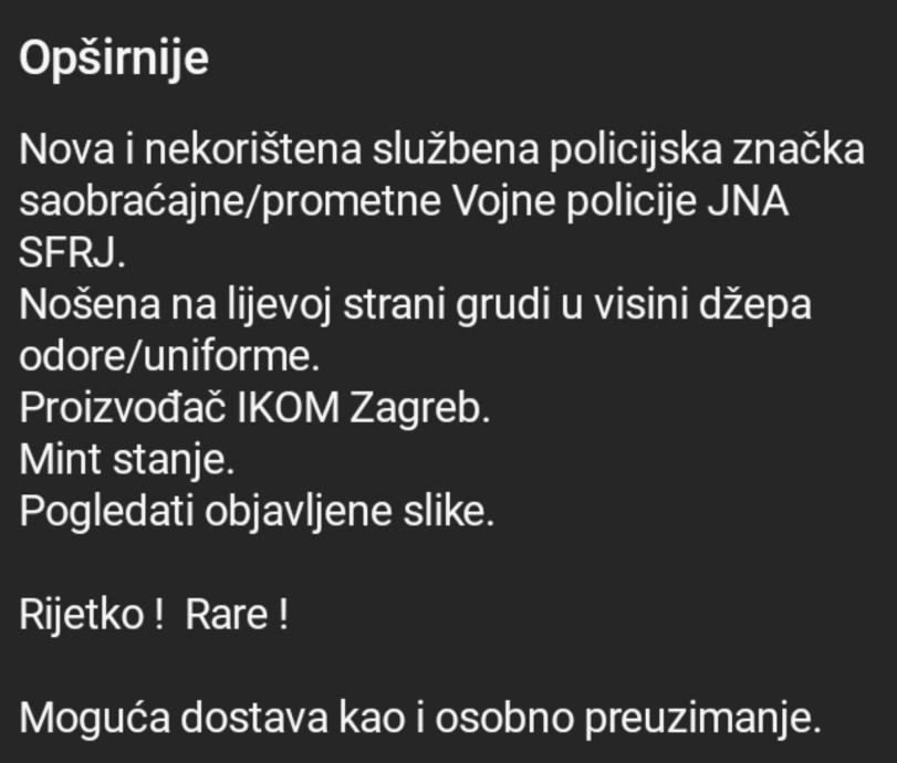 Nova i nekorištena službena policijska značka saobraćajne/prometne Vojne policije JNA SFRJ.