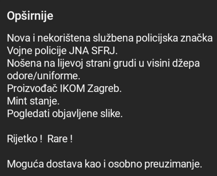 Nova i nekorištena službena policijska značka Vojne policije JNA SFRJ.