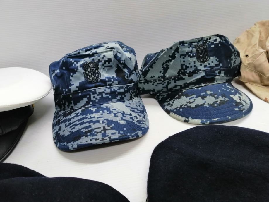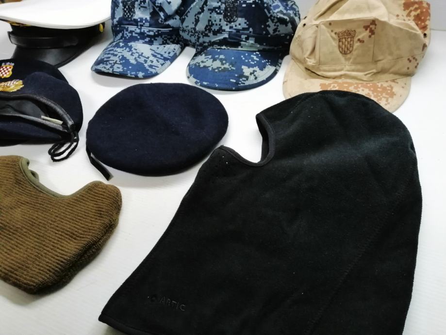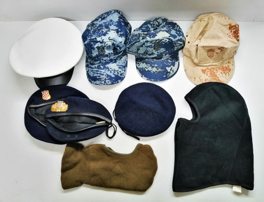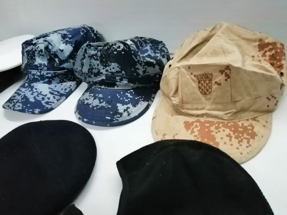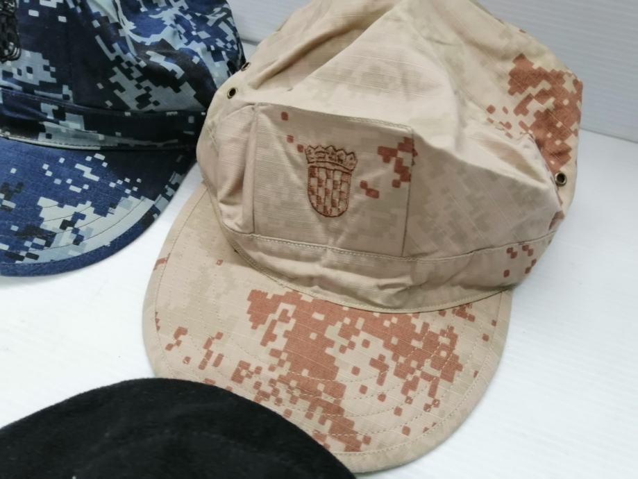 Hrvatska Vojska / Hrvatska Ratna Mornarica / Hrvatsko Ratno Zrakoplovstvo vojne maskirne kape u Hrvatskom digitalnom uzorku (modre HRM, HRZ ljetna i zimska sa postavom, HV pustinjski uzorak), HRM šapka, HRM beretke, Comando beretka, potkapa pamučna, potkapa od neoprena, sve veličine 57-58, kratko korišteno, očuvano.
