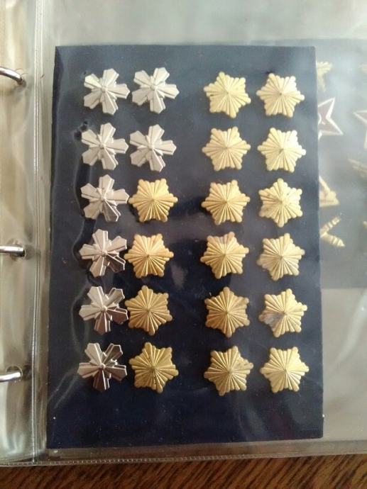 Prvi komplet činovi 50€.šaljem preporučeno uplatom na moj tekući račun+ troškovi poštarine.Čin general major je prodan (gornji lijevo)i velika i3male zvijezde sa srpom.