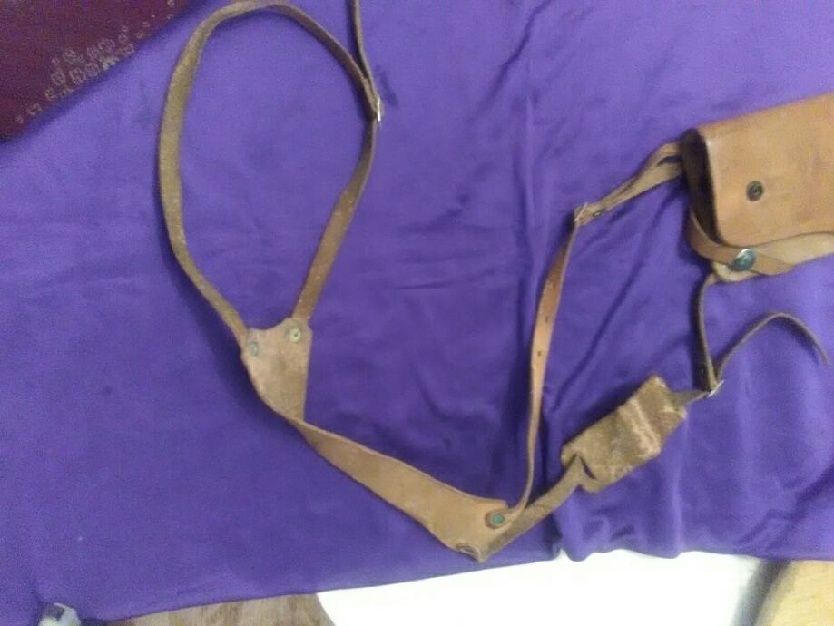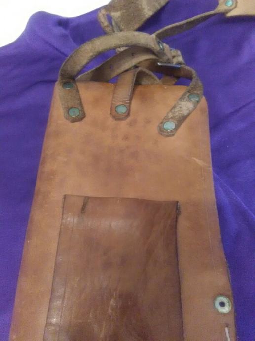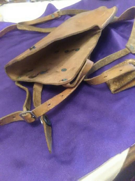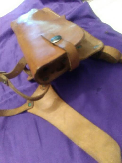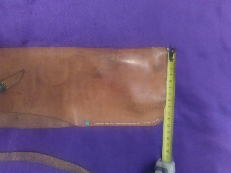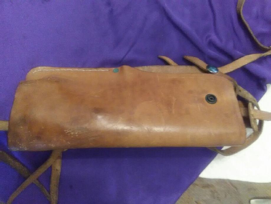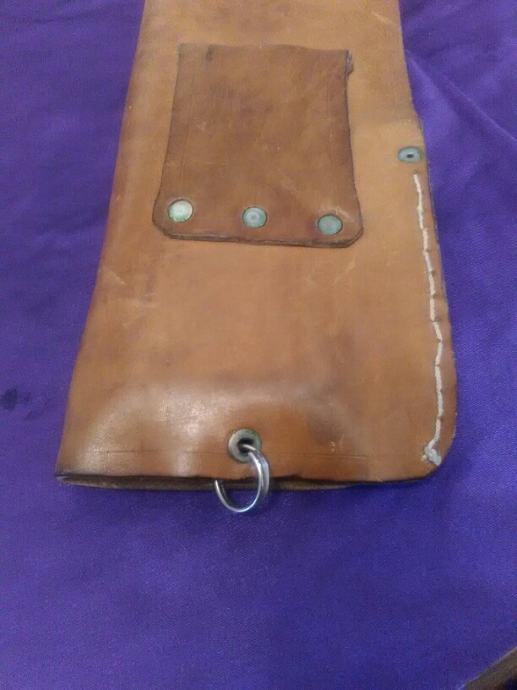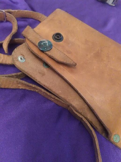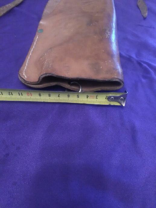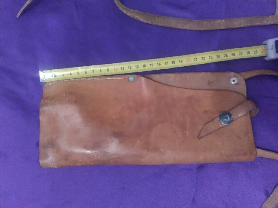 28x12cm od teleće box kože(vojni opasaći su se radili od iste) futrola za" škorpion " mini strojnicu (dužili su ih tenkisti) u originalnom stanju. Vide se tragovi korištenja (futrola je poprimila oblik" škorpiona") ali je ispravna, potpuna i nigdje oštećena.