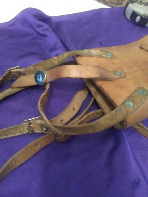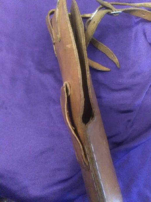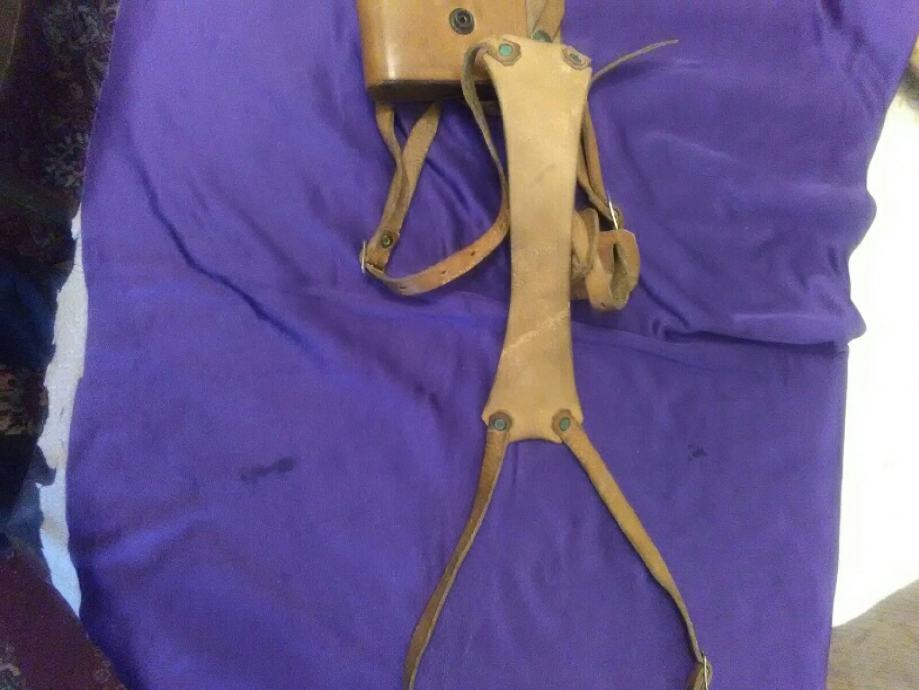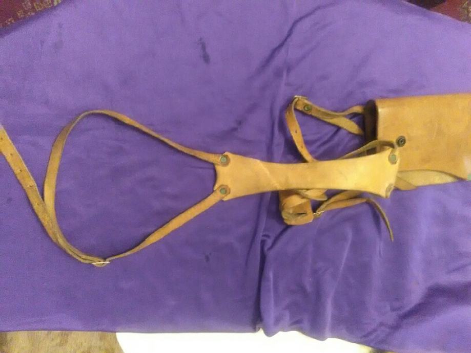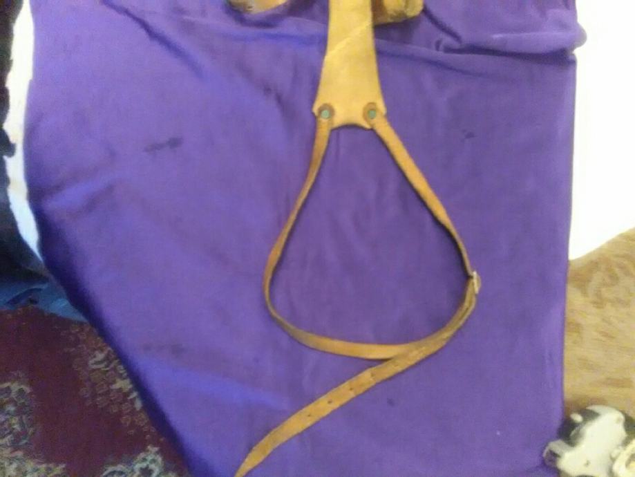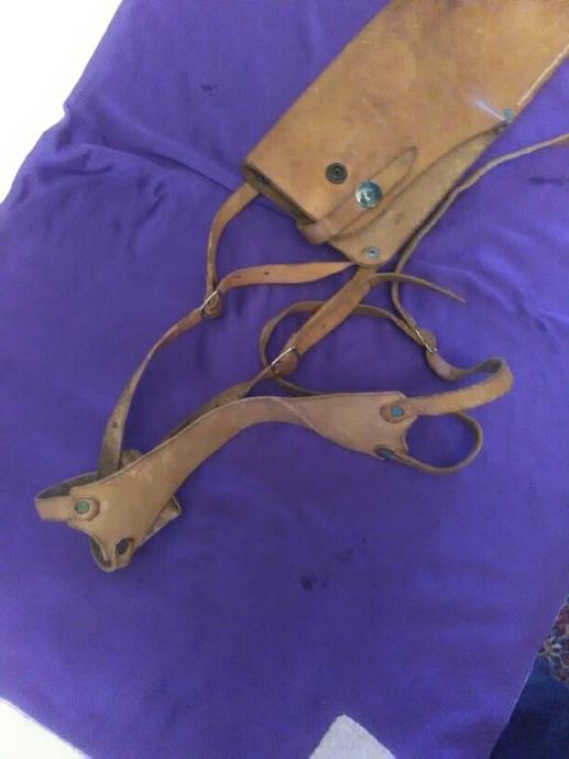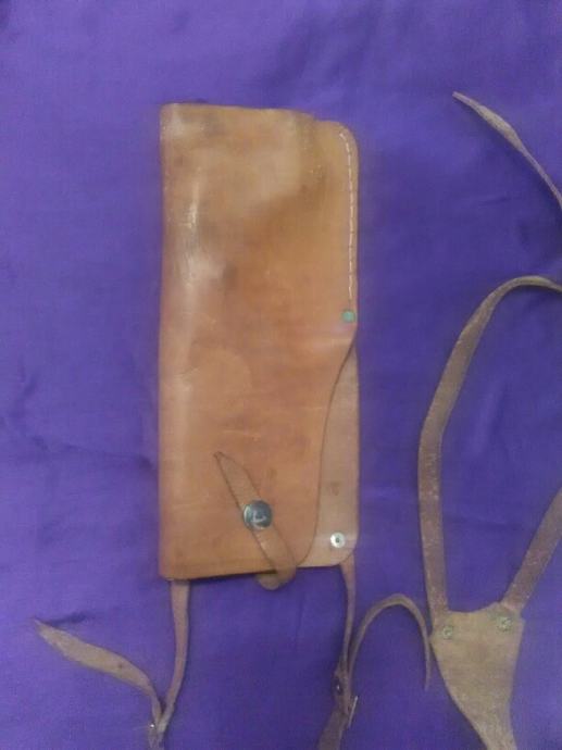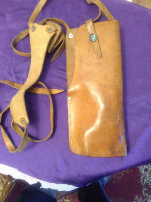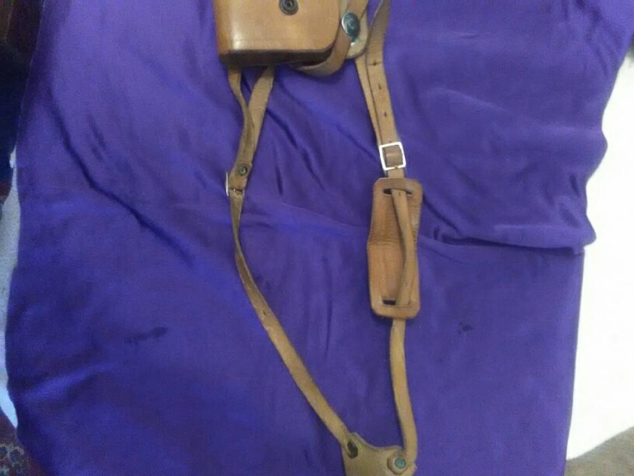 28x12cm od teleće box kože(vojni opasaći su se radili od iste) futrola za" škorpion " mini strojnicu (dužili su ih tenkisti) u originalnom stanju. Vide se tragovi korištenja (futrola je poprimila oblik" škorpiona") ali je ispravna, potpuna i nigdje oštećena.