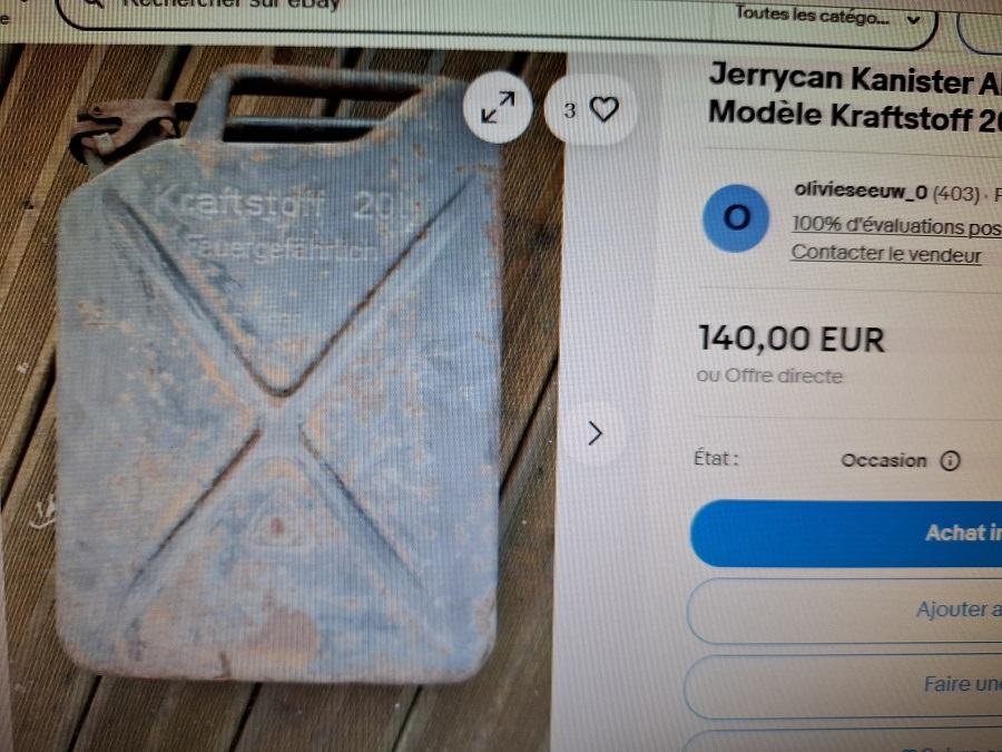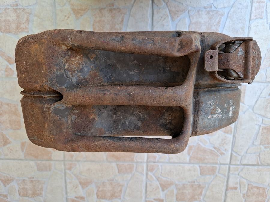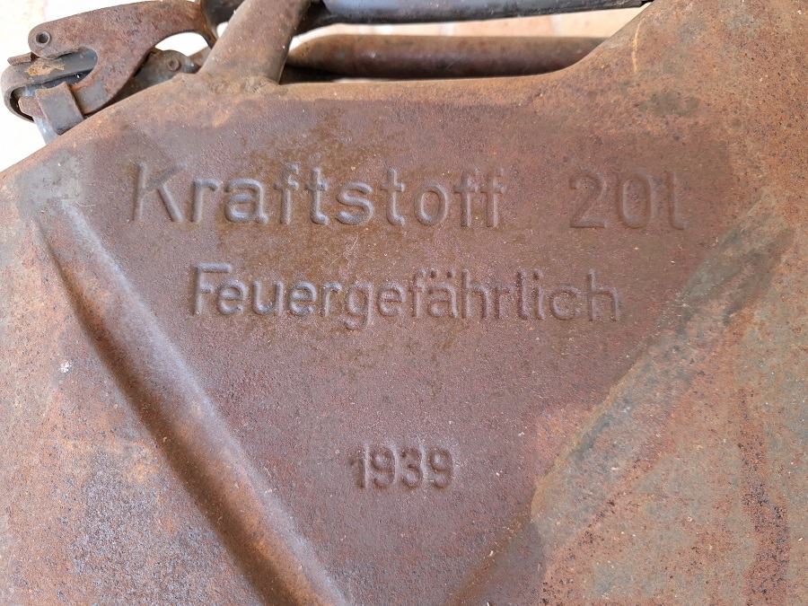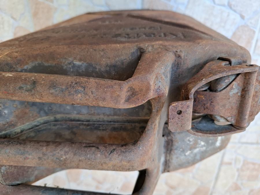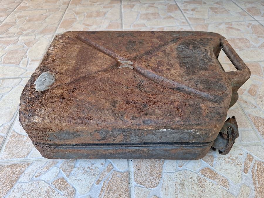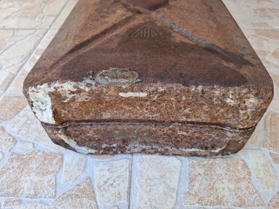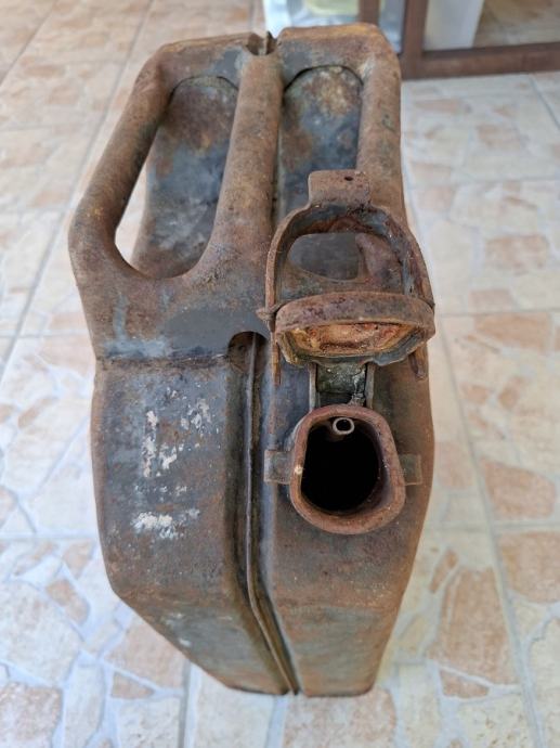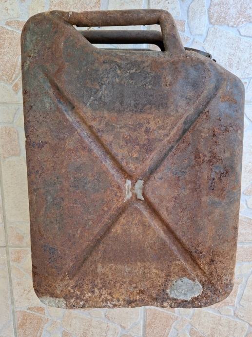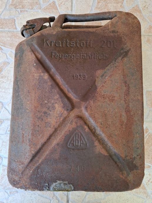 Prodajem kanister za gorivo iz WW 2,1939 godina,njemački,potrebna obnova ako će se koristiti ili ne ako ide u nečiju kolekciju,stanje kao na slici,nije trul,netko je davno prije pokrpao rupe cinom,kanister je prvi iz serije od 20 litara korišten u wehrmachtu i nema natpis u donjem dijelu (sve navedeno se lako provjeri na netu),šaljem pouzećem na trošak kupca(zadnja slika skinuta sa neta radi usporedbe)