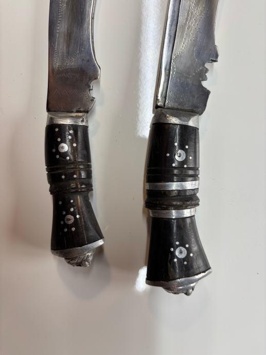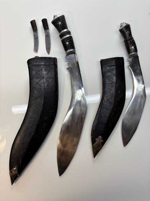 Prodajem 2 kukrija dužine 40 i 30 cm. Drška od roga, lavlja glava na stražnjem dijelu drške. Drvena futrola presvučena kožom. Stanje kao na slikama