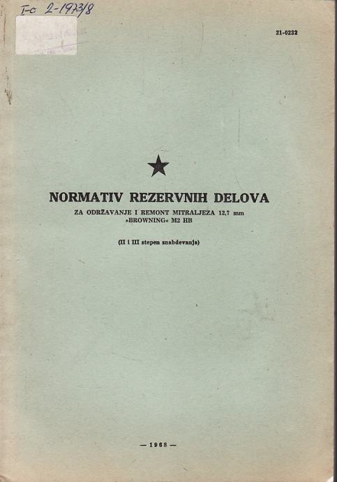 8. NORMATIV REZERVNIH DELOVA za održavanje i remont mitraljeza 12,7 mm BROWNING M2 HB , 1968. , meki uvez 98 str...…...150 kuna