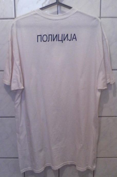 Na zadnjoj strani majice stoji natpis "policija" ćiriličnim pismom.