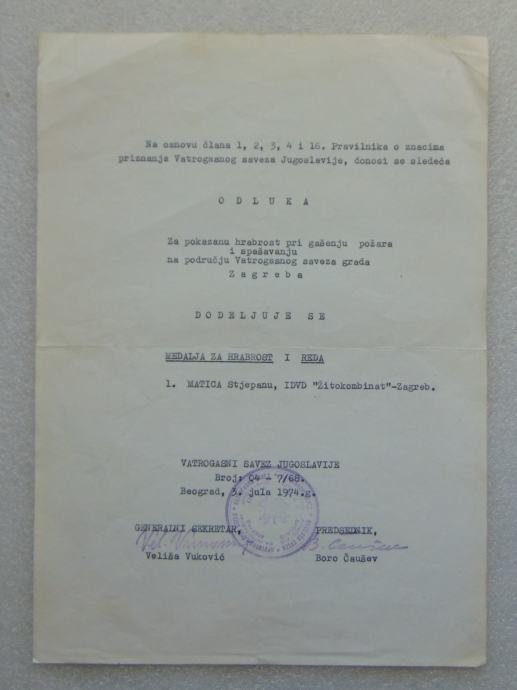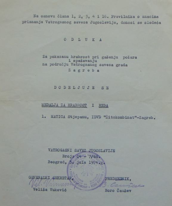 Medalja za Hrabrost I Reda - vatrogasna - Dokument