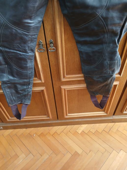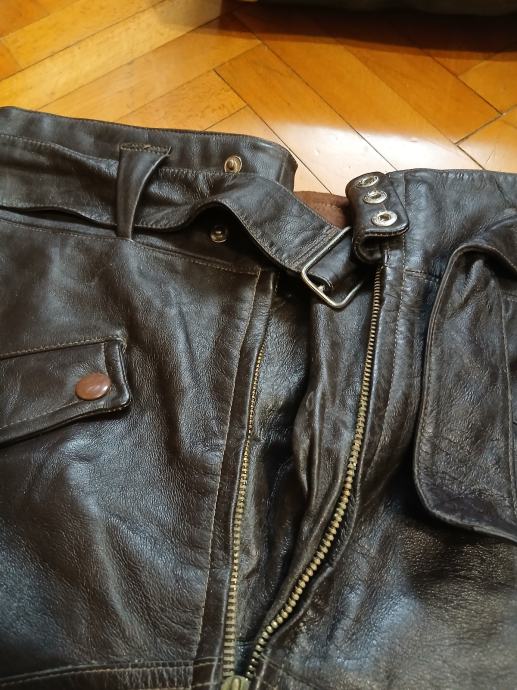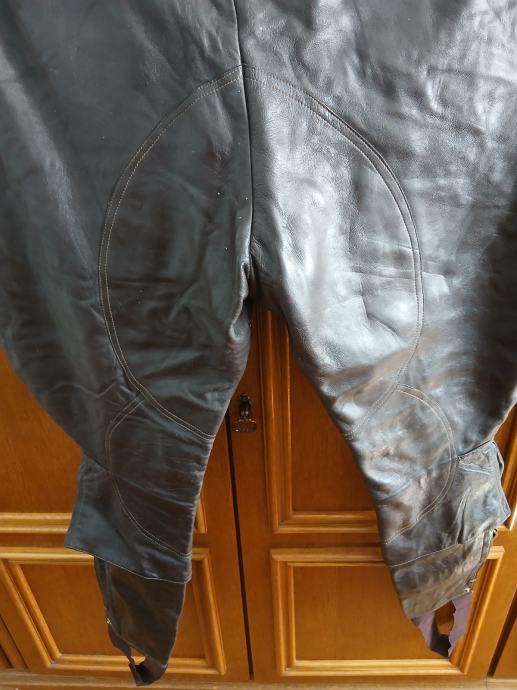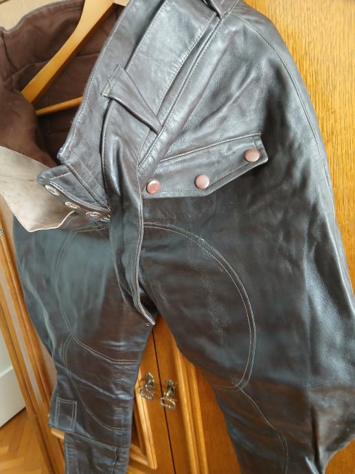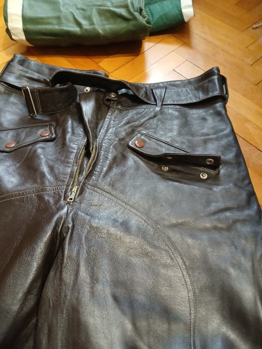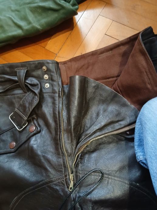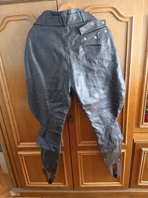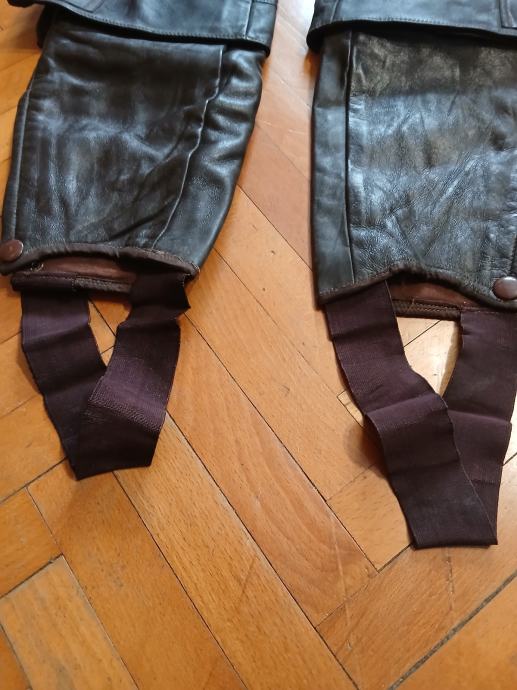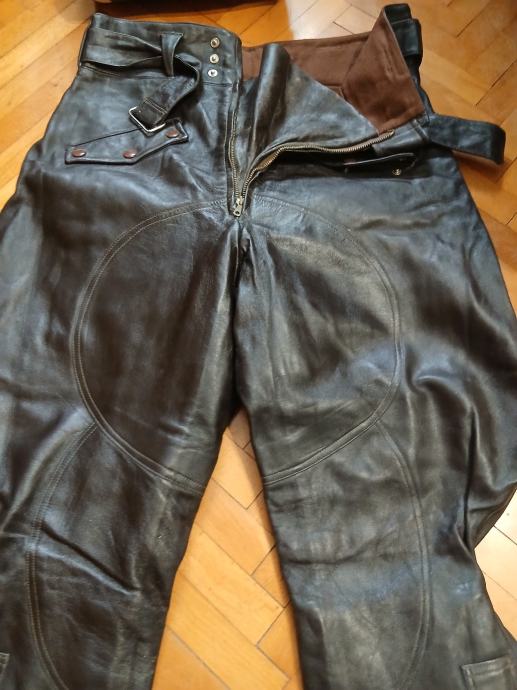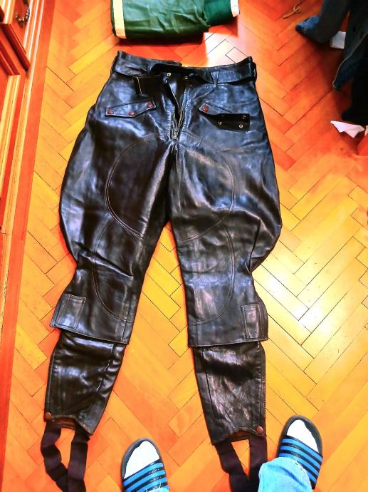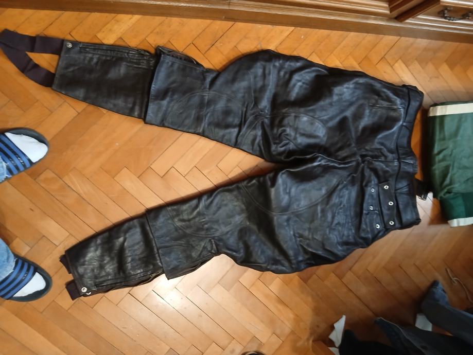 Kožne motorističke pumperice starosti cca 50 ili više godina korištene za pratnju Titovog Pullman Mercedesa (dolje ove hlače gore bijeli dio odore na Moto pratnji).Istražujte pa bidite..Pogodno i za ljubitelje oldtimer motocikala.Veličina vidljiva podstavljene vrlo debelo.Teške.Bez oštećenja.proizveo Galantex Pirot originalni remen je u njima stanje 9/10 zbog stajanja.(svaki motorist u pratnje imao je dva kompleta ove su vožene možda u dva tri navrata).Vozio je član obitelji...Osobna primopredaja ili dostava HP pouzećem o trosku kupca-u pitanju je njihova težina...Zamjene ne trebam.Zadnja cijena je ova koja piše.Gornji dio odore nemam.