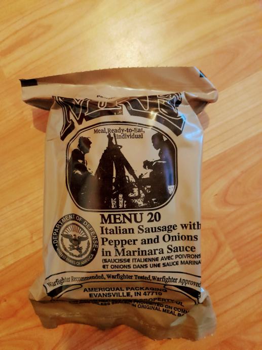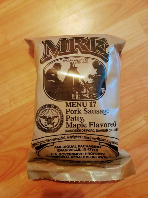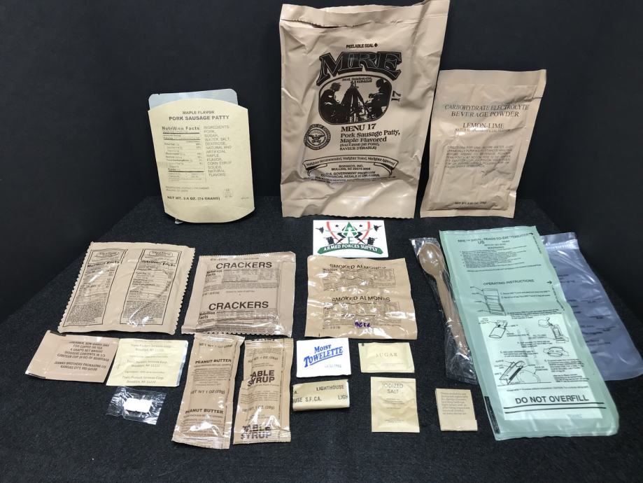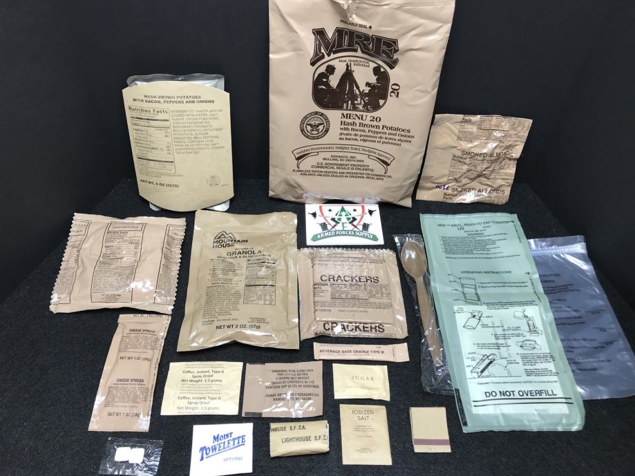 The MRE is a totally self-contained operational ration consisting of a full meal packed in a flexible meal bag. The full bag is lightweight and fits easily into military field clothing pockets. Each meal bag contains an entrée and a variety of other components as may be seen in the table of Menus.