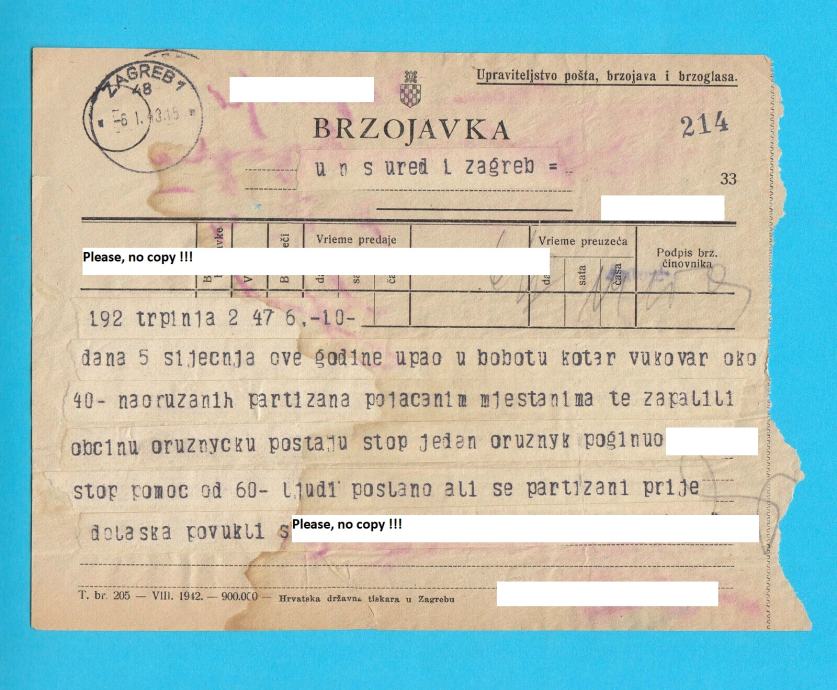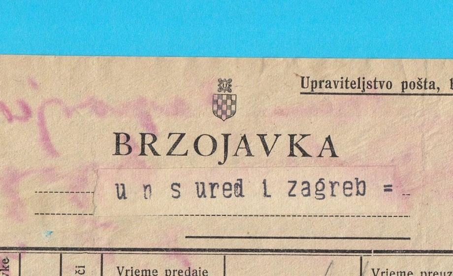 NDH - USTAŠKA NADZORNA SLUBA (UNS) orig. službeni telegram iz 1943. g.