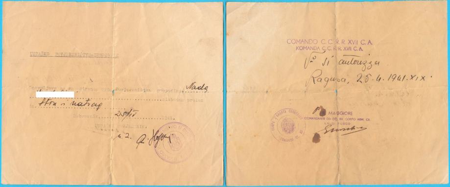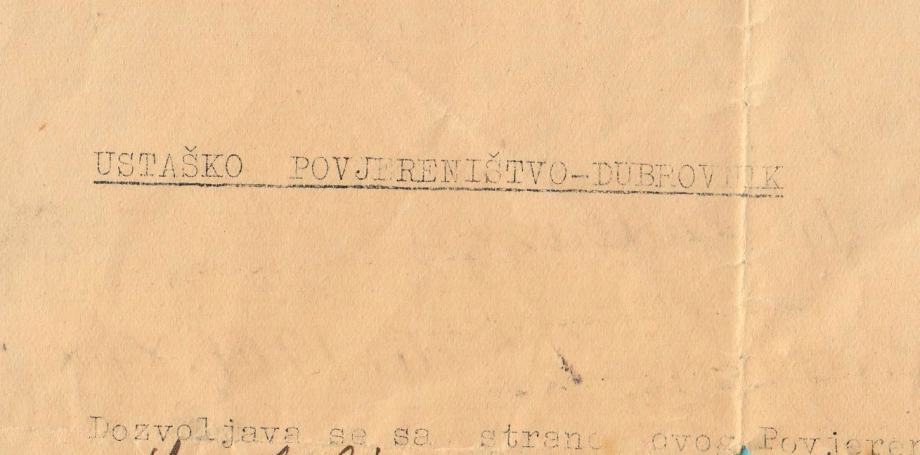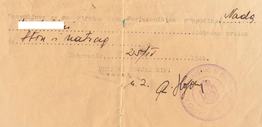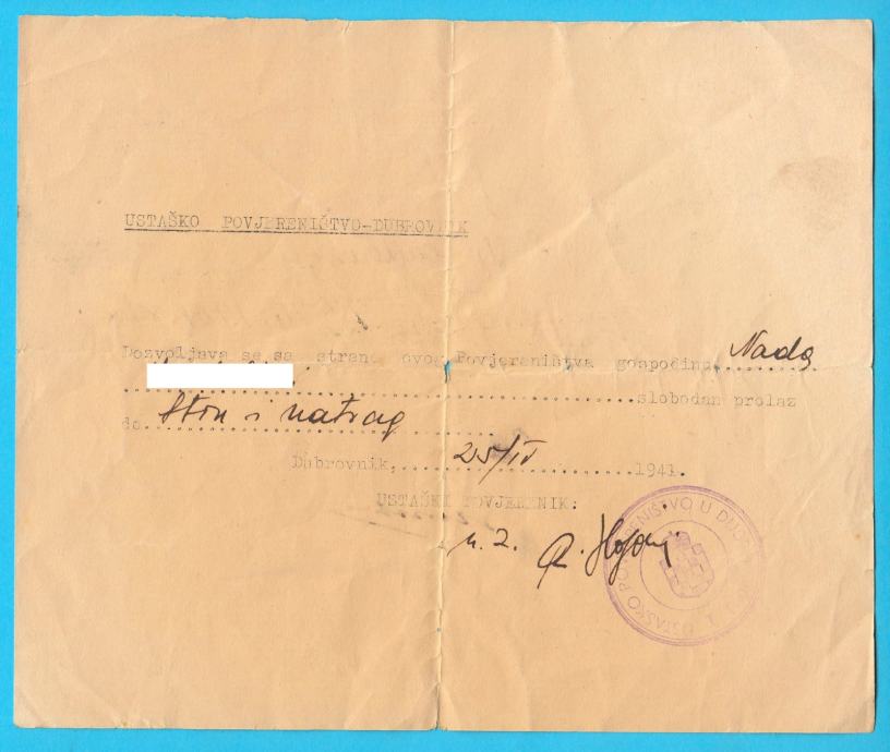 Stara originalna ustaška propusnica iz Dubrovnika, izdana 1941. godine za putovanje iz Dubrovnika u Ston i natrag. Naslovljena je na ime stanovite gospođe Nade (zbog zaštite privatnosti, prezime sam sakrio).