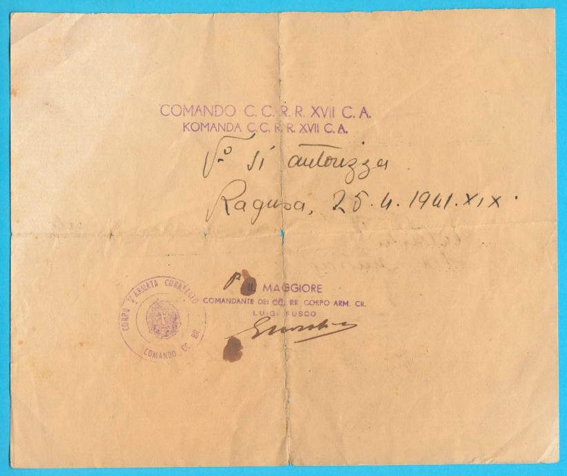 NDH USTAŠKO POVJERENIŠTVO DUBROVNIK Propusnica Ston - Dubrovnik 1941.g