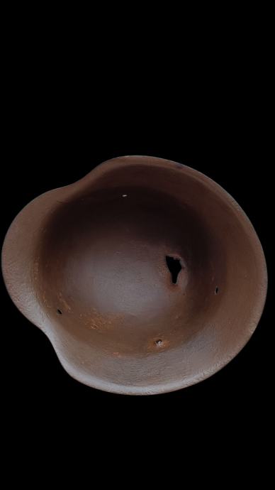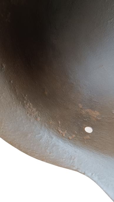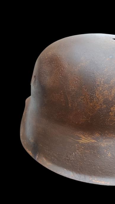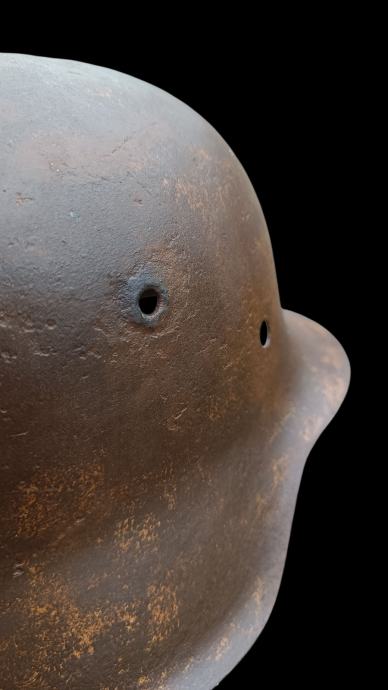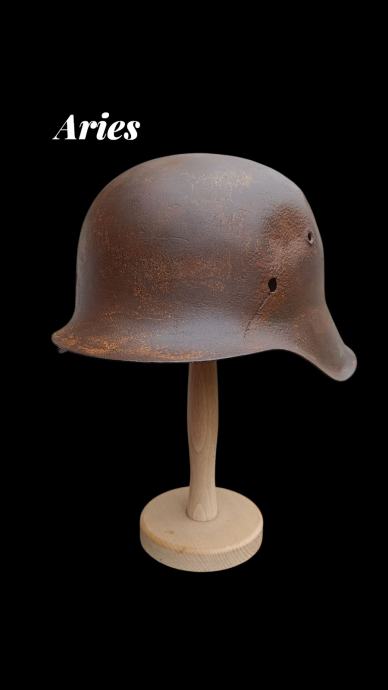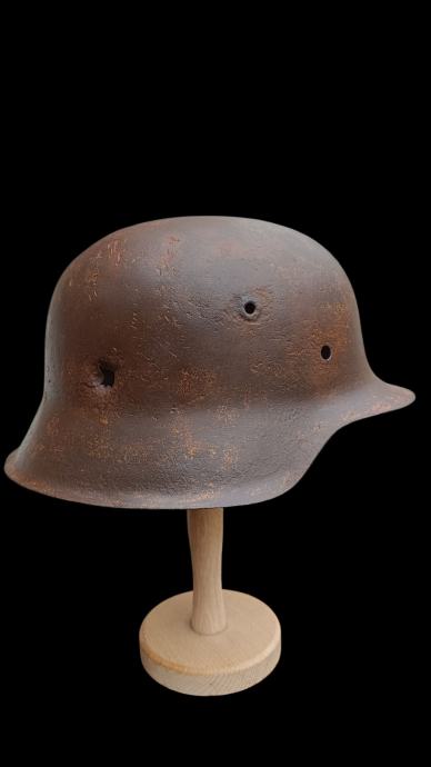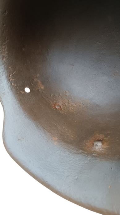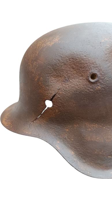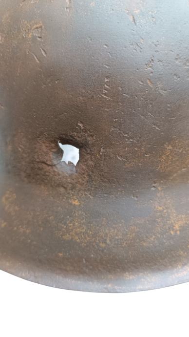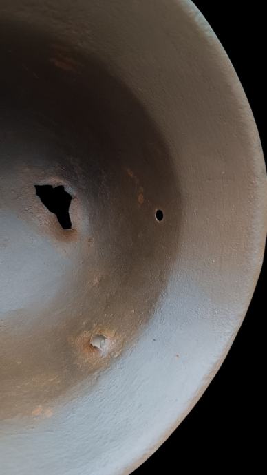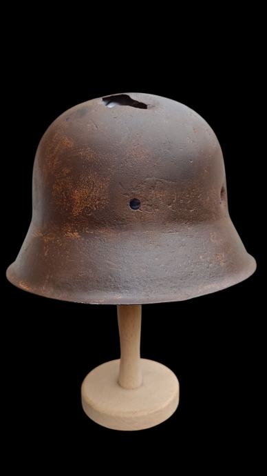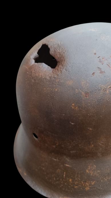 Kaciga sa ostacima kamuflaže i oštečenjima iz borbe.
